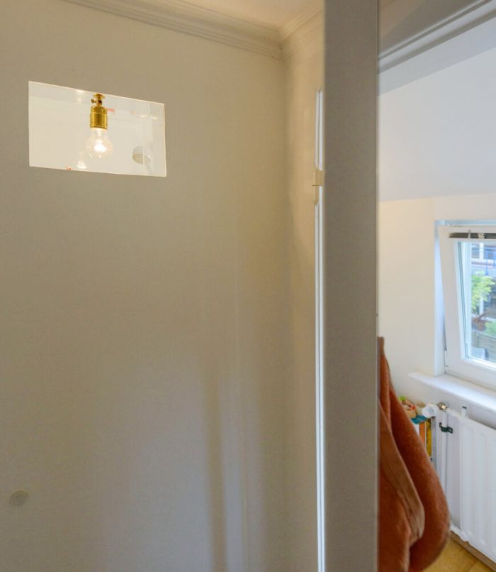Die integrierte Glühbirne beleuchtet gleichzeitig Duschbad und Flur und das Aquarium ist beidseitige Ablage. Die Stirnansichten der Wand sind auf dem Vitrinenglas mit Spiegelfolie kaschiert, die das Licht reflektiert.