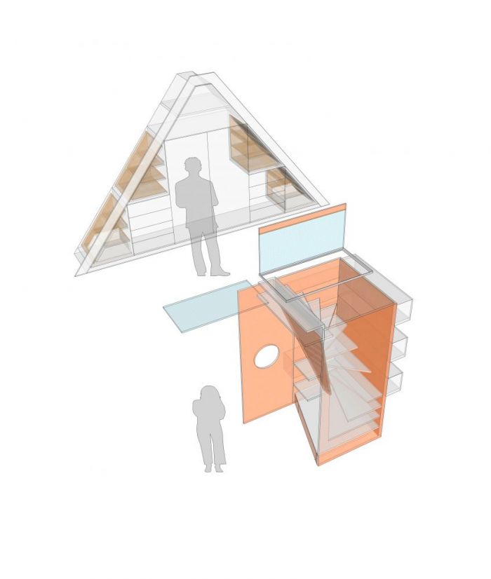 Basierend auf dem Raumkonzept der 1m2 Treppe von SCSH02 bewegt man sich auf einer weiterentwickelten Wendeltreppe, deren „imaginäre Spindel“ diagonal im Raum platziert ist. An Stelle der Spindel sind die Stufen an einer dreieckigen Wange befestigt, die dreidimensional im Raum verdreht ist. Auf diese Weise wird das maximale Volumen des Treppenraumes zur Erschließung genutzt und es entstehen keinerlei Resträume. Zusätzlich ist unter der ersten Podeststufe noch eine großzügige Schublade eingepasst.