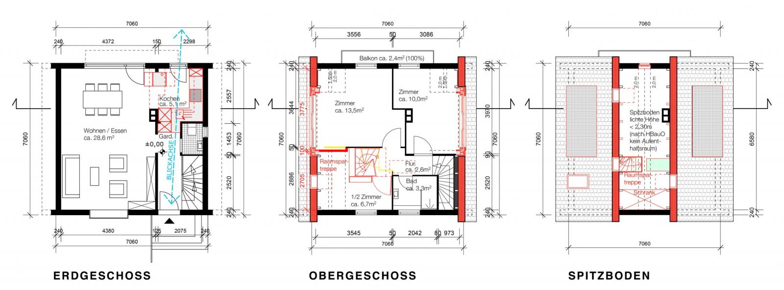 Neben der Aufsparrendämmung des Daches wurde das Haus v.a. durch eine zusätzliche Innendämmung aus Kalziumsilikatplatten vor der einschaligen, 24cm dicken Außenwand energetisch ertüchtigt. Der bauzeitliche, grobe Kellenputz der Fassade wurde von abblätternden Farbresten befreit sowie neu gestrichen und der Bestandsbalkon wurde neu abgedichtet.