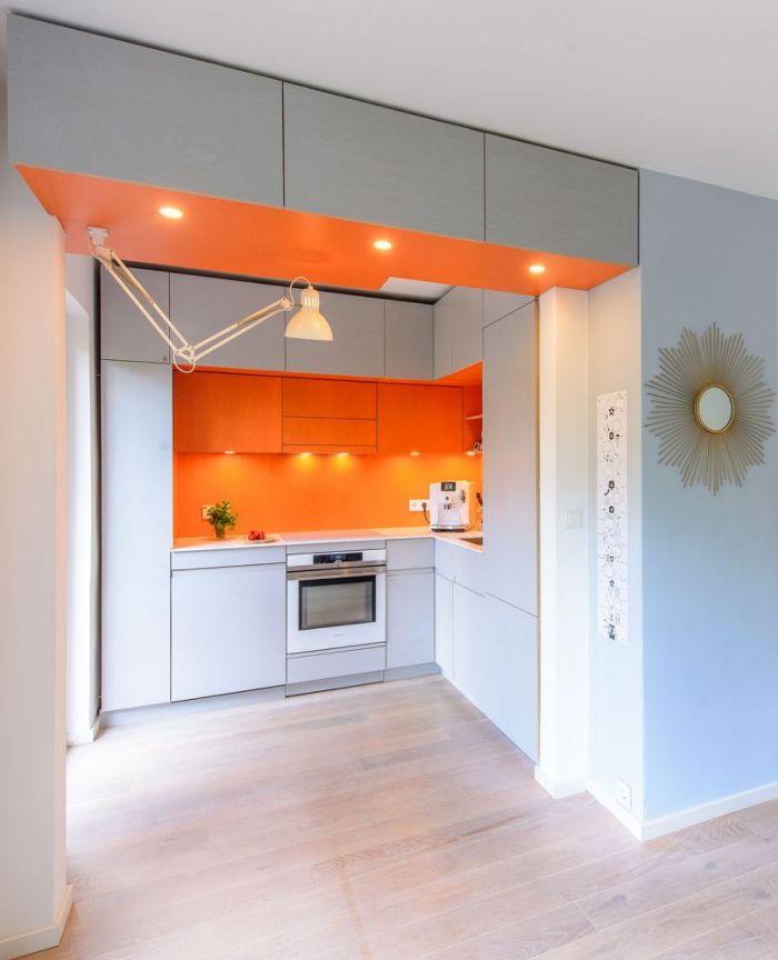 Die zweifarbigen Küchenfronten sind, ebenso wie die Treppenwangen im Obergeschoss, aus Koski Sperrholzplatten mit geölten Kanten gefertigt. Die Fronten der 60cm tiefen Elemente sind in Hellgrau ausgeführt und die eingeschnittenen Flächen über der Anrichte kontrastieren in strahlendem Orange. Zwei Lagen mit Oberschränken nutzen das volle Stauraumpotenzial und ein ausziehbarer Tritt unter dem Ofen erleichtert die Zugänglichkeit. Die Anrichte besteht aus einer weißen Mineralwerkstoffplatte, aus der die Abtropfrinnen herausgefräst wurden.