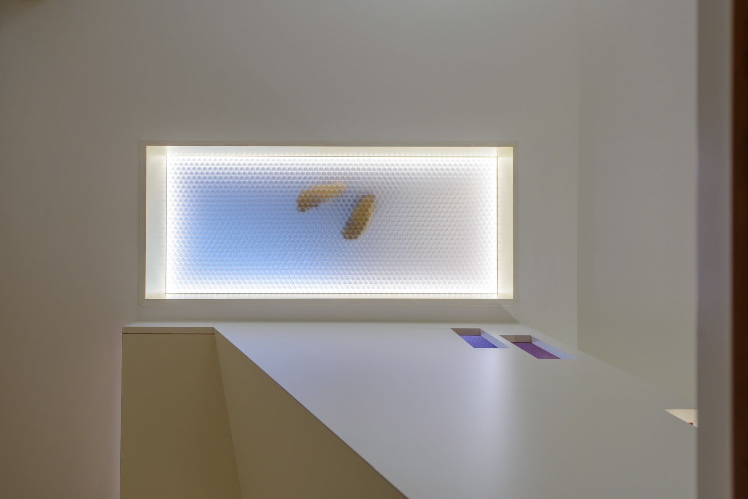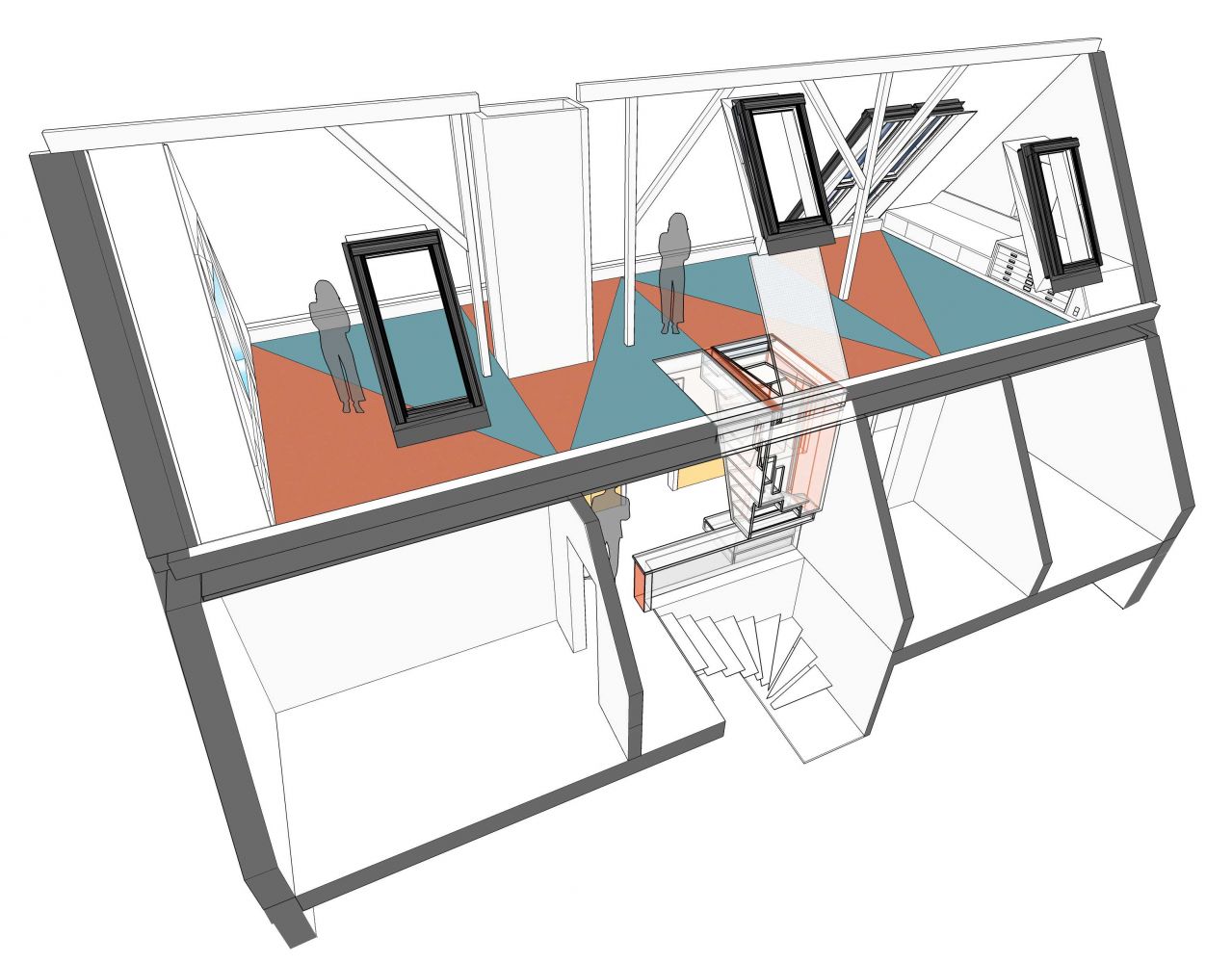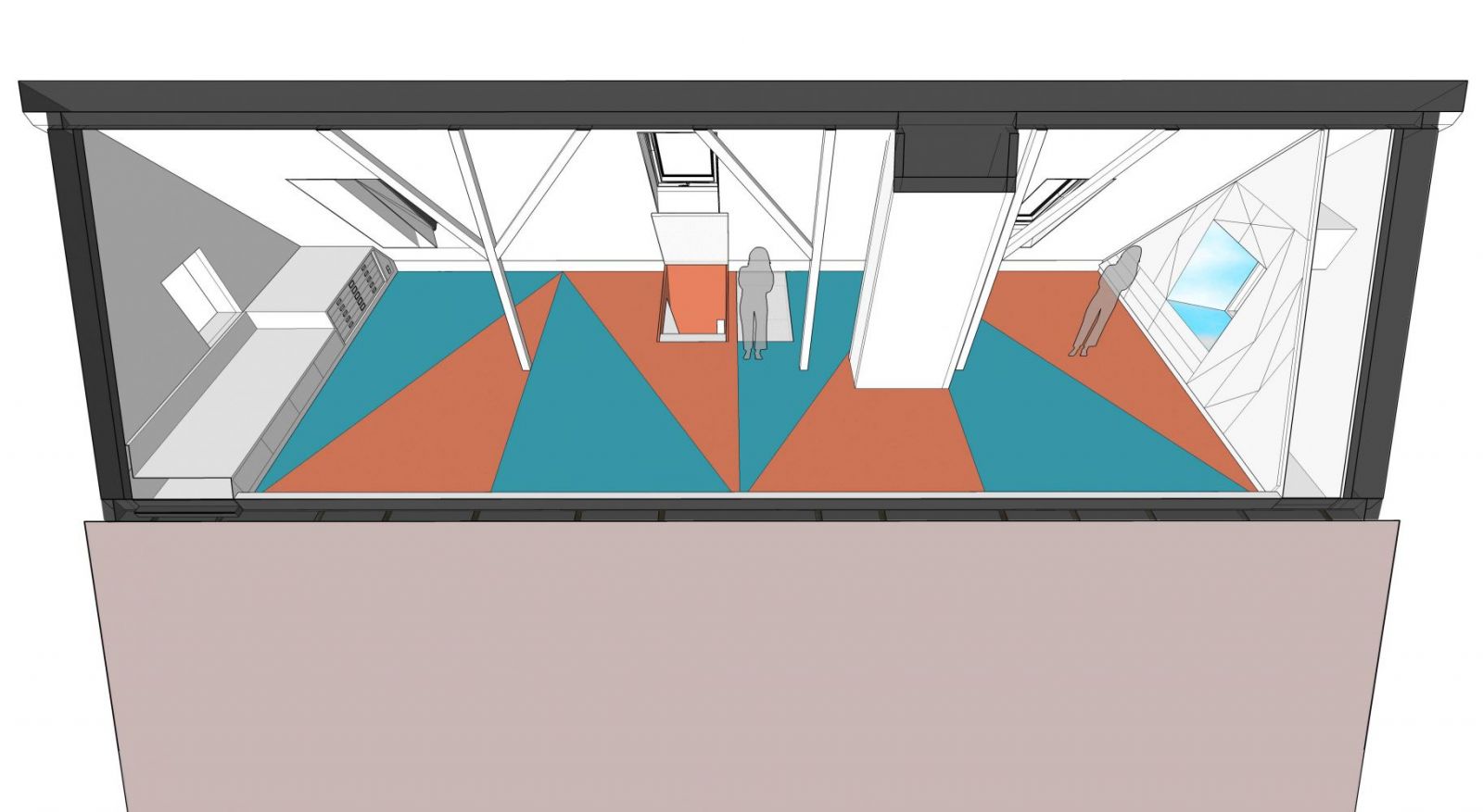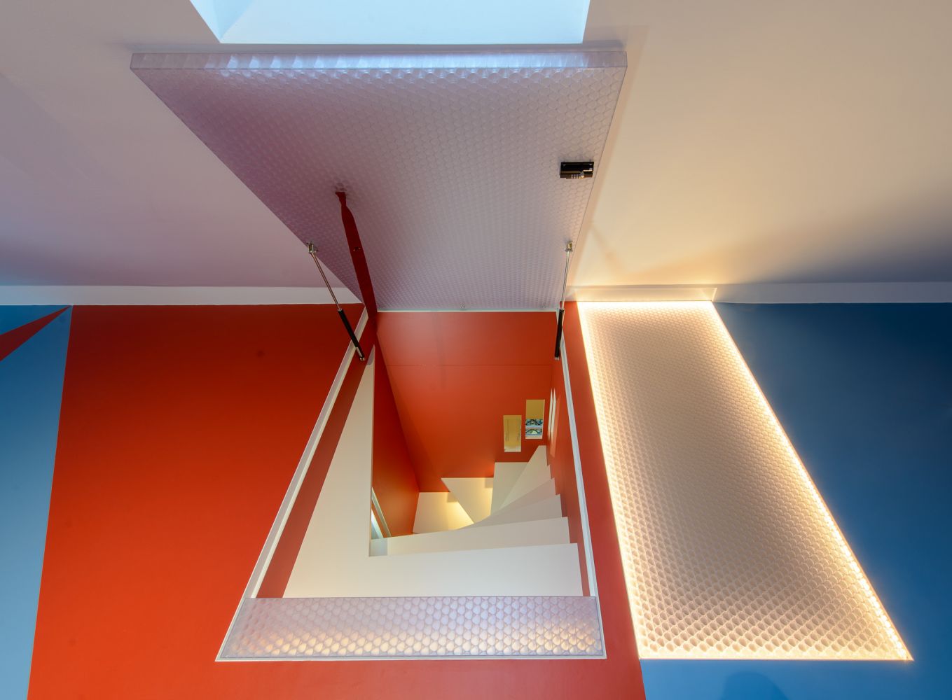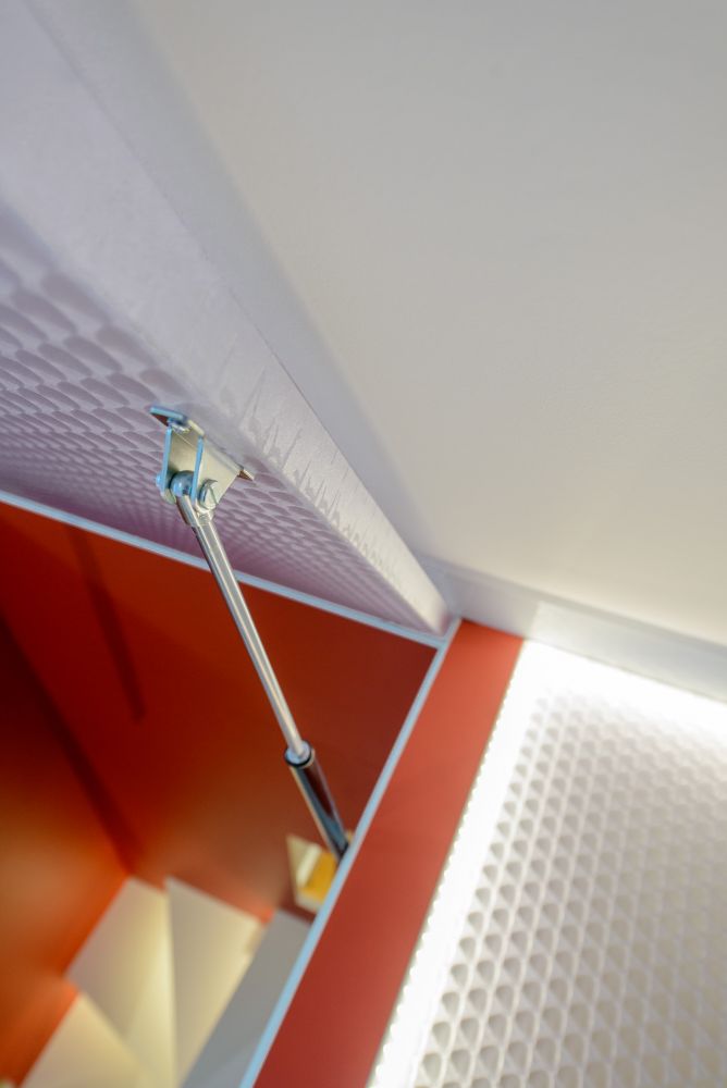 Den Raumabschluss zum Spitzboden bildet eine Klappe mit Gasdruckfeder-Unterstützung aus begehbarem, transluzentem Polycarbonat-Wabenkernmaterial. Das daneben angeordnete Oberlicht aus gleichem Material kann zum Transport sperriger Gegenstände herausgenommen werden und ist mit einer zusätzlichen Beleuchtung aus LED-Strips ausgestattet.