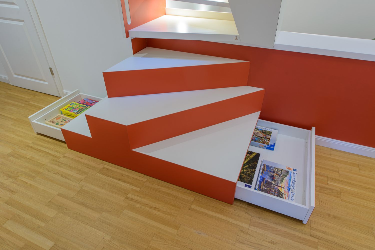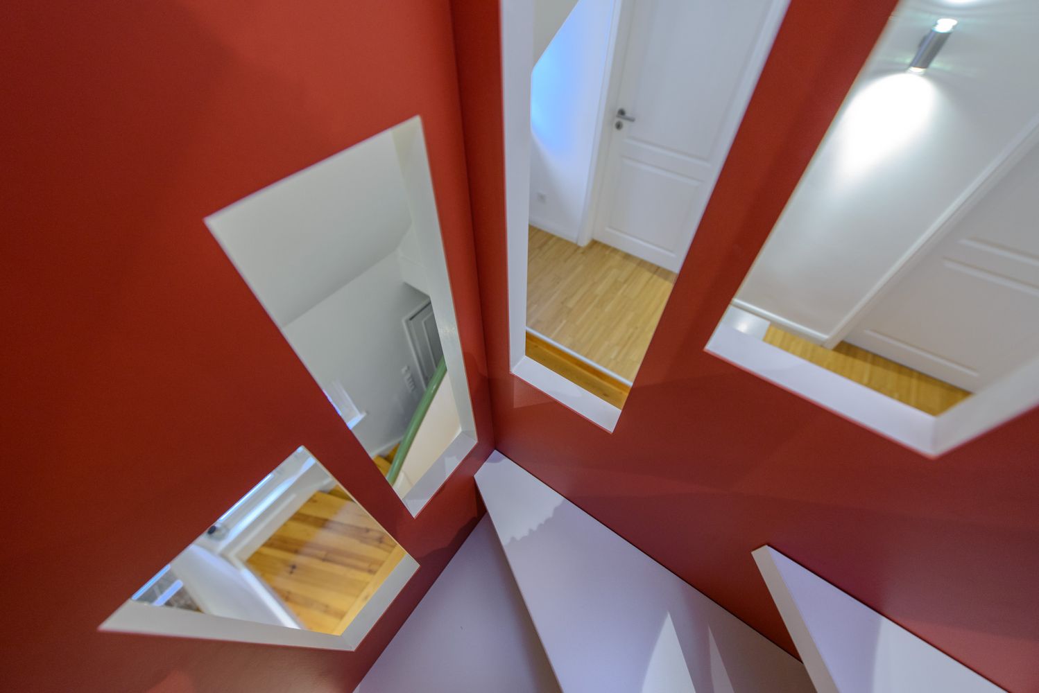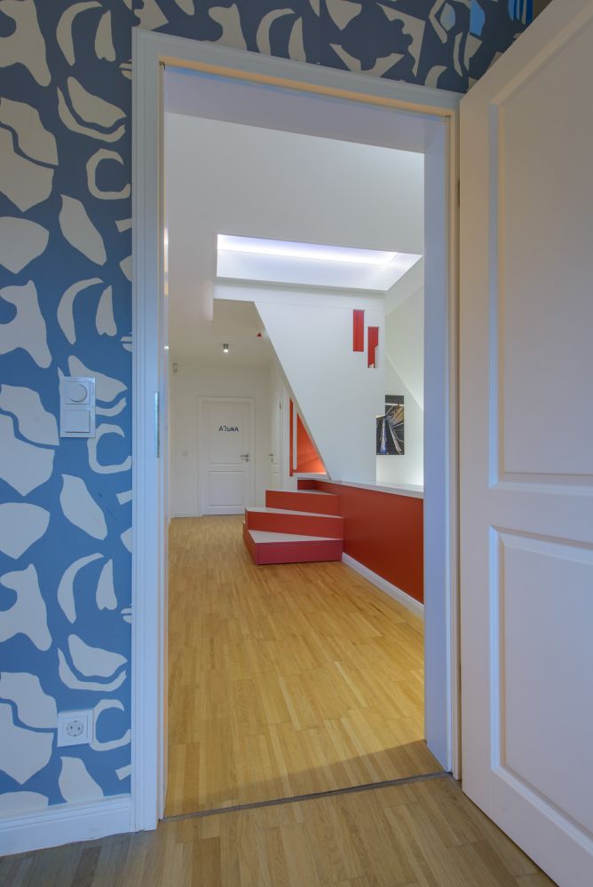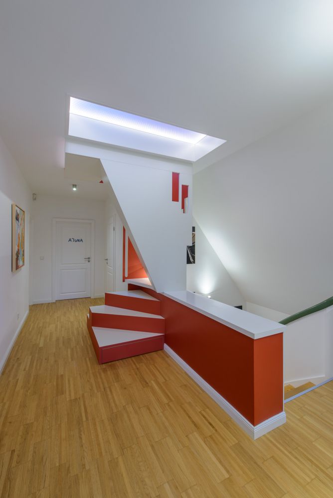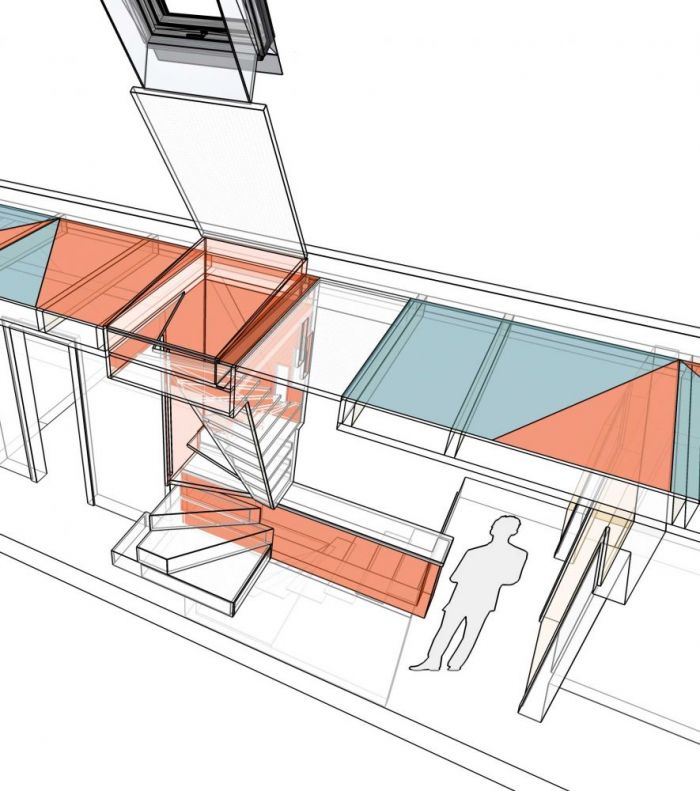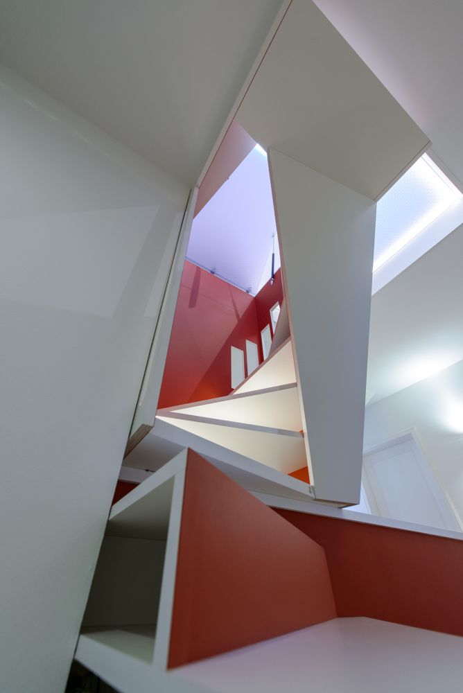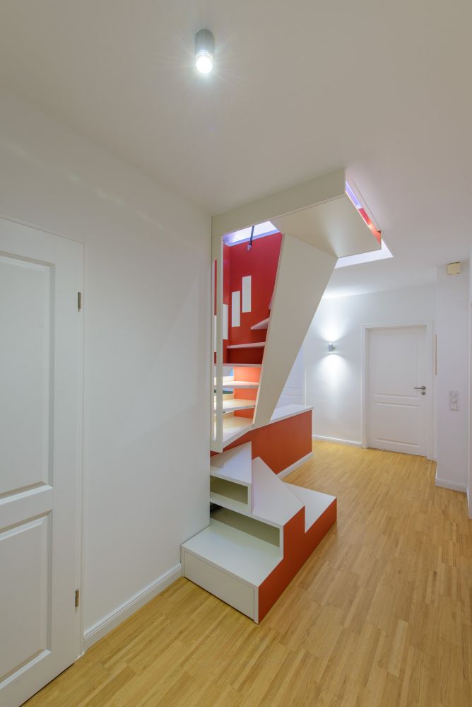 Die Bestandssituation erlaubte den Austausch der historischen Auszugtreppe durch eine „1m2-Raumspartreppe“, die auf der Brüstung der Absturzsicherung der bestehenden Treppe zum Erdgeschoss abgestellt werden konnte. Drei Podeststufen mit Auszügen führen auf Brüstungshöhe in den Treppenraum hinein, dessen Fensteraussparungen diagonale Blickachsen über mehrere Etagen ermöglichen. Die Durchgangsbreite des Flures bleibt an jeder Stelle größer als 1,0m.