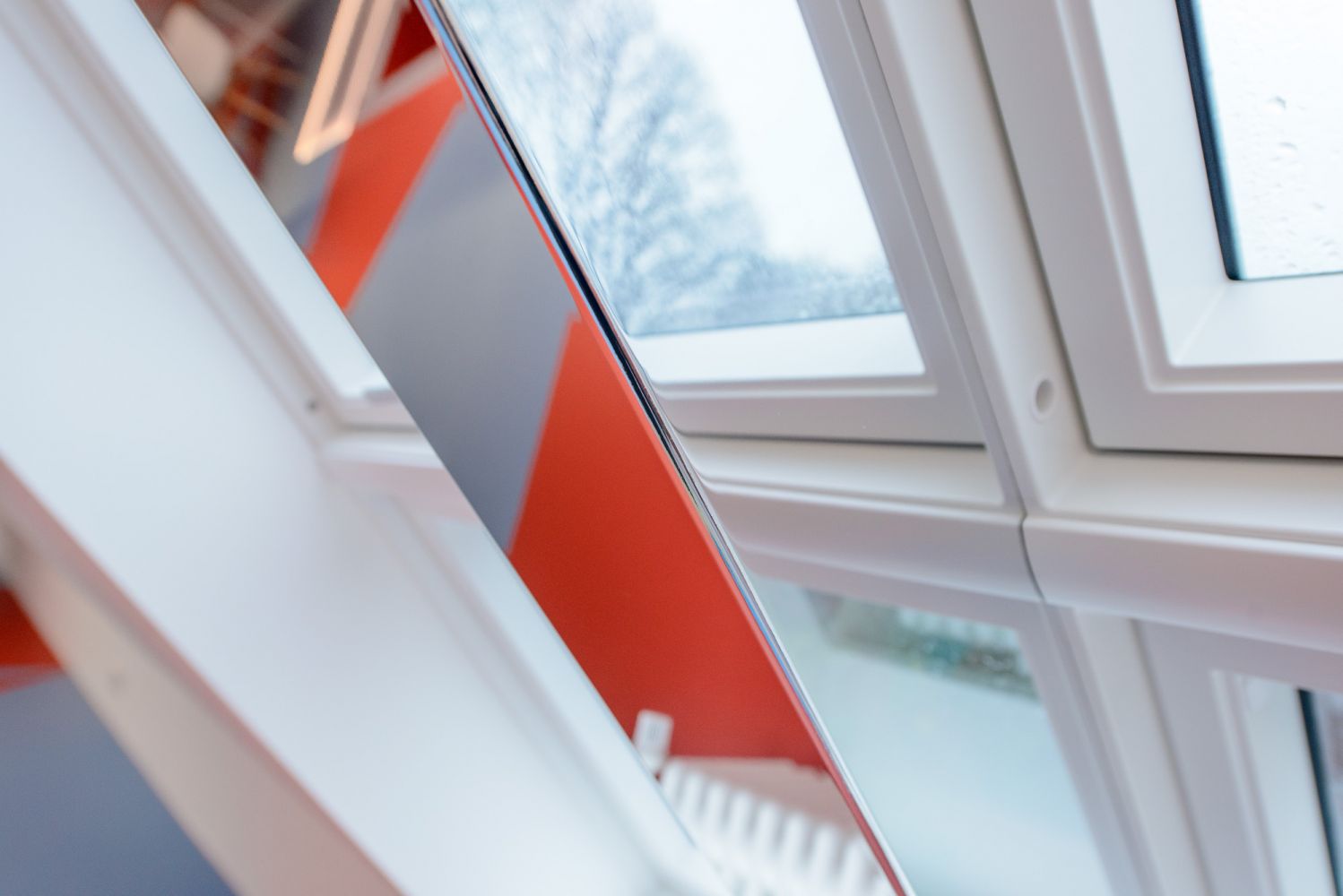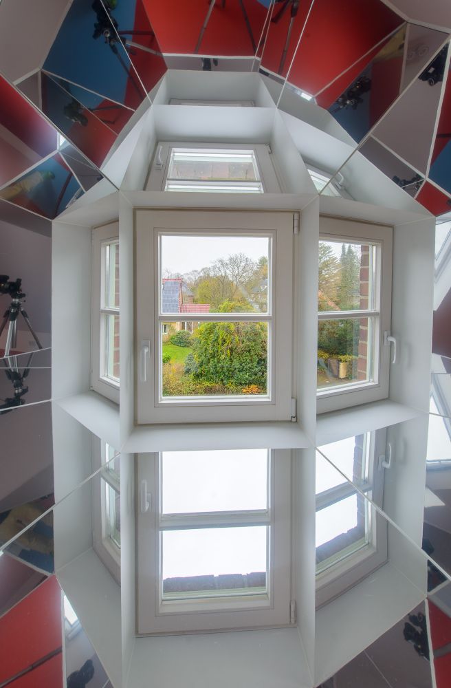Eine weitere Besonderheit stellt der homogen verspiegelte Mittelpfosten des großen, vierteiligen „Quartett“-Dachflächenfensters dar. Die seitlichen Spiegelflächen reflektieren die Glasflächen, sodass der Horizont ohne Unterbrechung durch den Dachsparren „optisch durchläuft“. Das Plattenmaterial, eine Dibond-Spiegelplatte, wurde rückseitig gefast und konnte, dreiseitig gekantet, komplett fugenlos eingebaut werden!