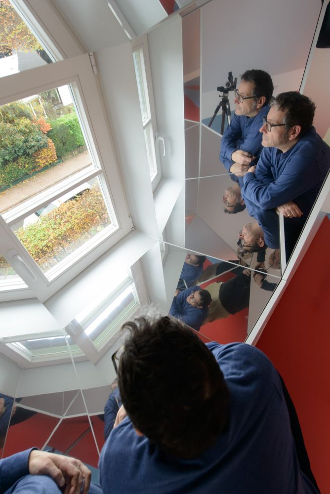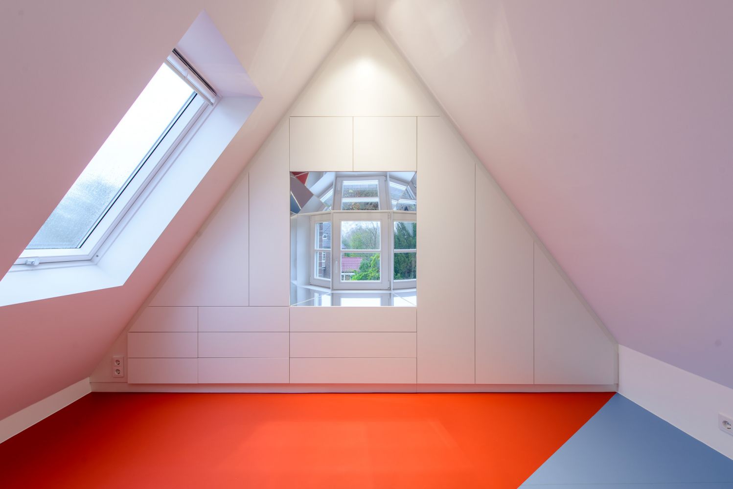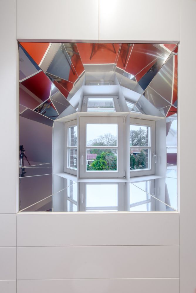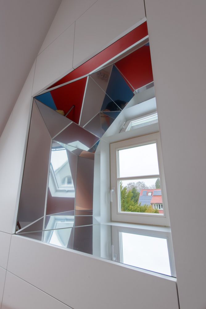 Beide Giebelseiten des Spitzbodens sind mit Einbaumöbeln zur Archivierung ausgestattet. Straßenseitig dominiert ein flächenfüllender, 60cm tiefer Multifunktionsschrank mit 11 Auszügen und zahlreichen Klappenfächern. Eine Aussparung gibt den Blick frei auf das Bestandsfenster, dessen asymmetrisch schräg angeordnete Laibungen komplett verspiegelt sind und das Tageslicht tief in den Raum reflektieren. Die zahlreichen Reflexionsebenen erzeugen kaleidoskopische Spiegelungen, die je nach Blickwinkel das kleine Bestandsfenster als Teil eines verglasten Erkers erscheinen lassen.