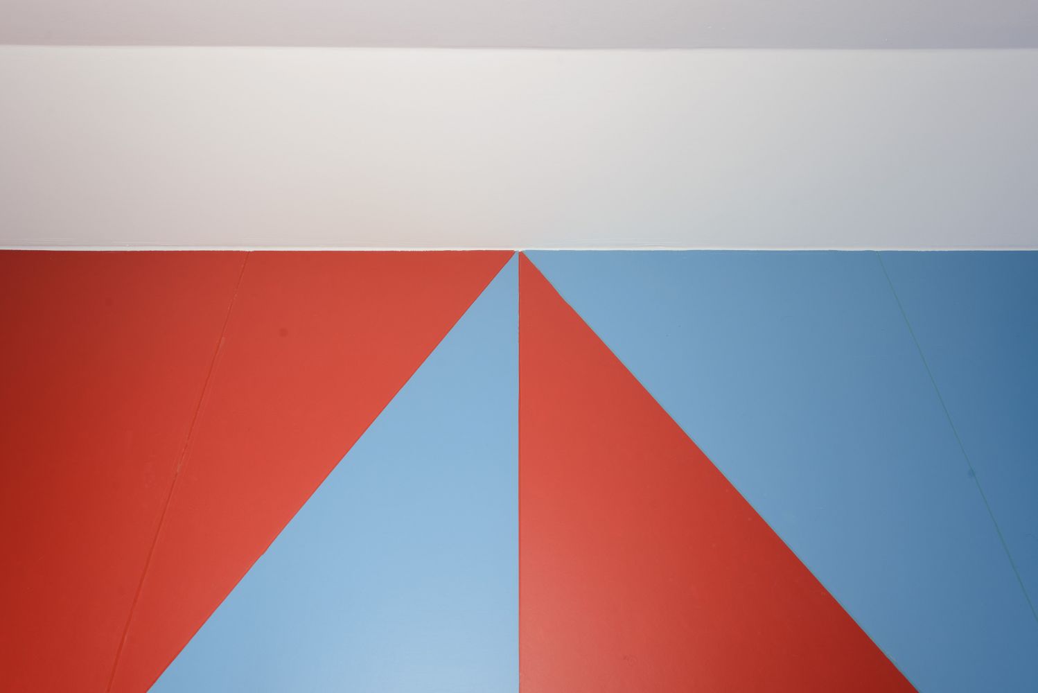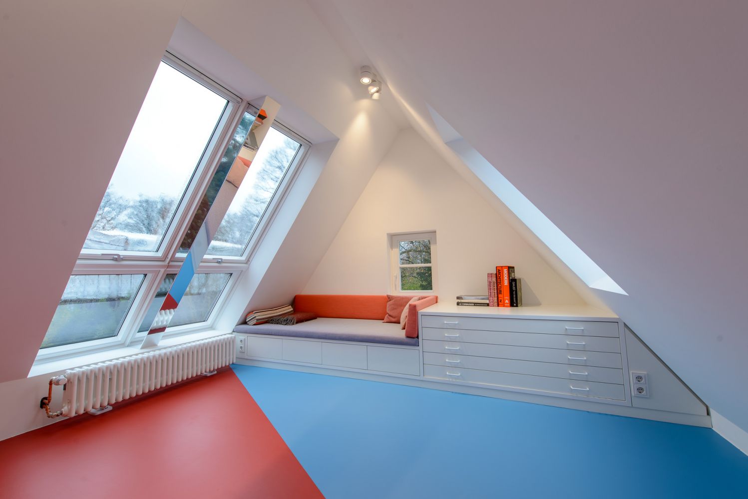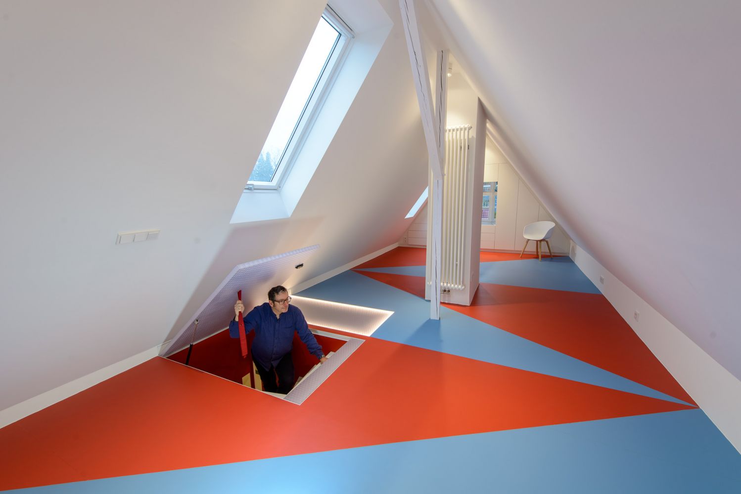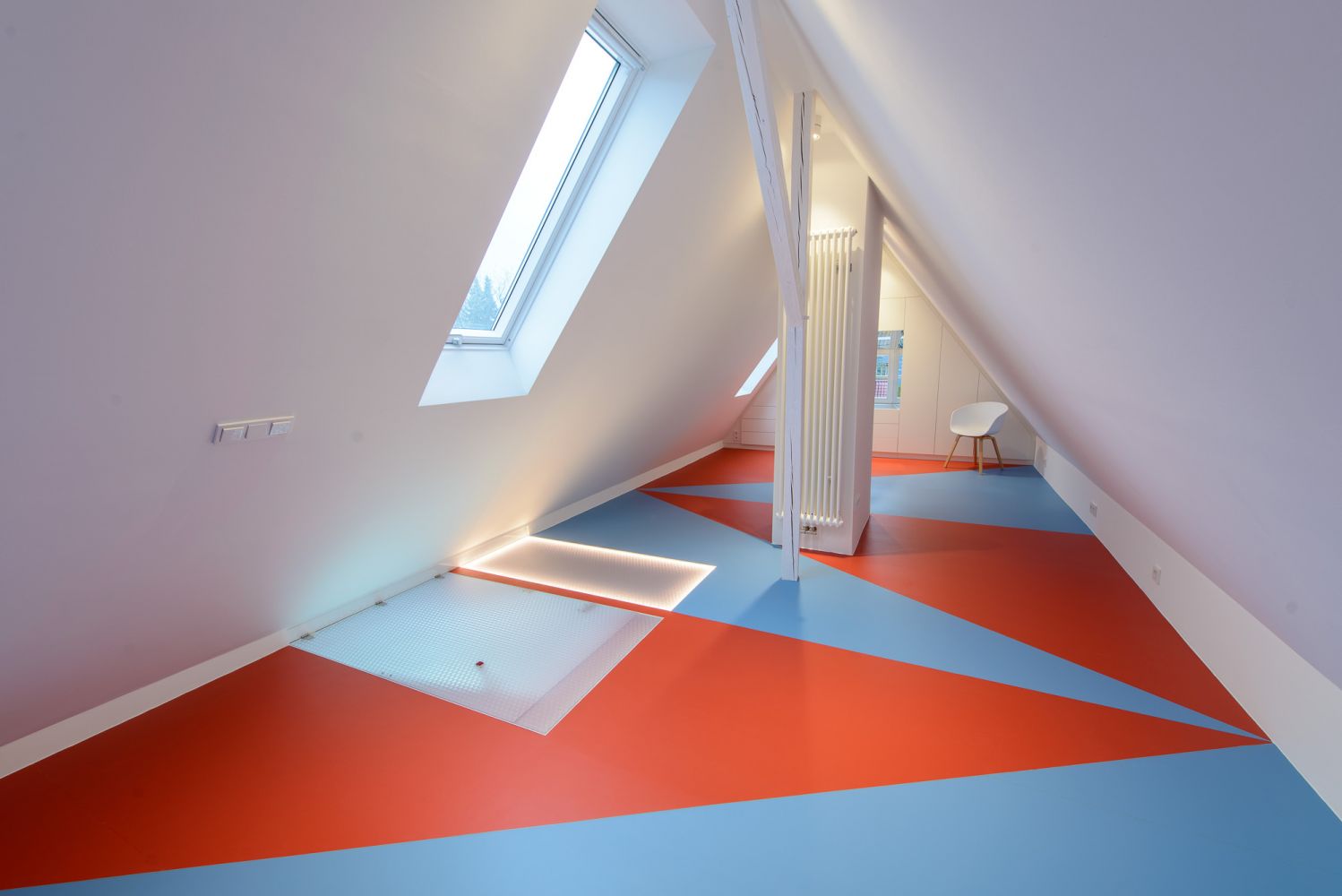 Das Naturprodukt Linoleum setzt sich durch Geruch und Haptik positiv von anderen Oberflächenbehandlungen ab. Zusätzlich bietet es die Möglichkeit einer expressiven zweifarbigen Fußbodengestaltung. Die in rote und blaue Dreiecke aufgelösten Flächen sind exakt an die Randbedingungen vor Ort angepasst. Vor allem die Eckpunkte von vier aufeinandertreffenden Flächen erfordern einiges handwerkliches Geschick und wurden von der ausführenden Firma mustergültig umgesetzt.