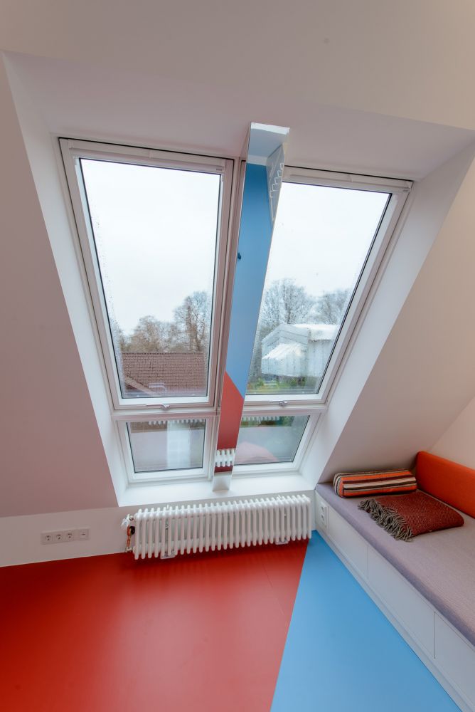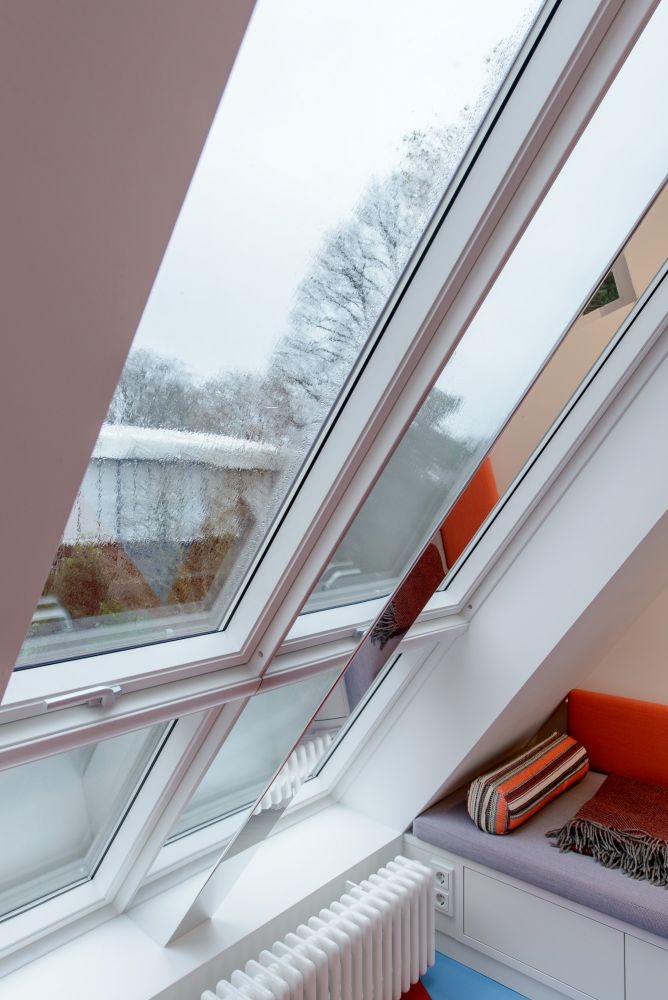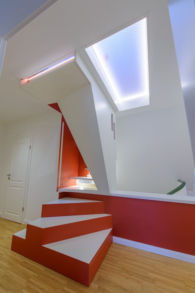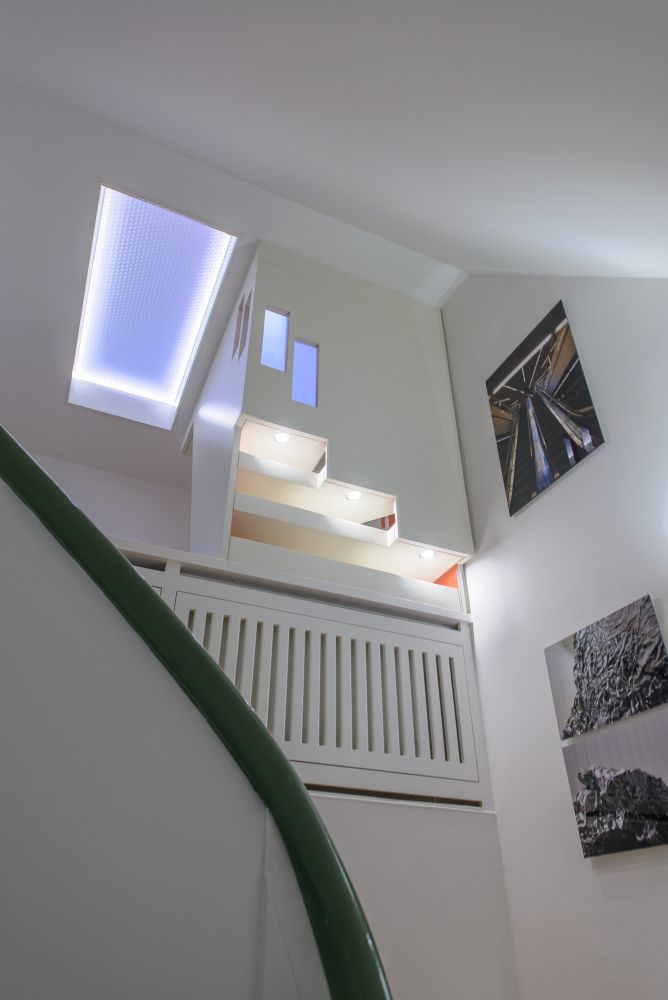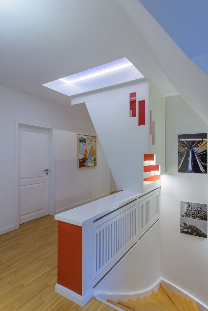 Fünf neue Dachflächenfenster mit außenliegendem Sonnenschutz sorgen für Tageslicht im Spitzboden und durch die transluzenten Wabenkernplatten auch im darunterliegenden Flur. Zusätzliche Lichtquellen in den Treppenstufen beleuchten direkt und indirekt den Flur sowie die Bestandstreppe zum Erdgeschoss.