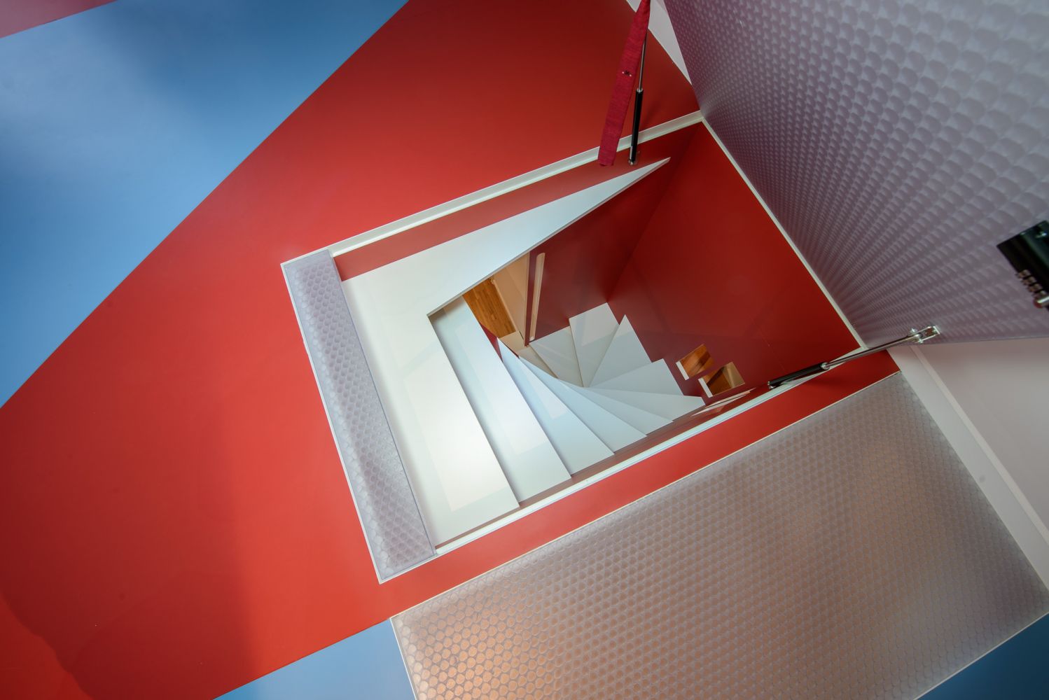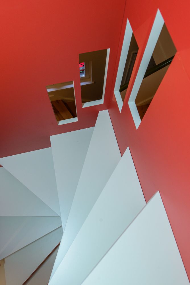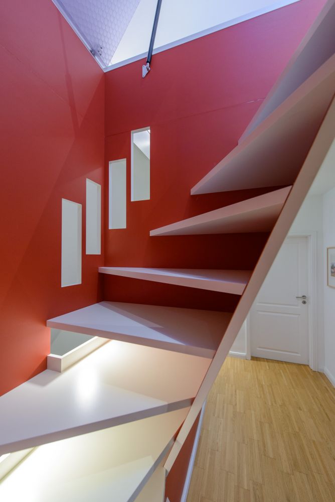 Der rote Farbton sämtlicher vertikaler Elemente von Treppe und Brüstung entspricht exakt der ursprünglichen Farbgebung der Brüstung. Im Gegensatz zum Bestand kam hierbei jedoch kein Anstrich zum Einsatz. Alle vertikalen Flächen sind mit 2,5mm starkem rotem Linoleum beschichtet, das nahtlos im Fußbodenbelag des Spitzbodens fortgeführt wird. Die Beschichtung mit Fußbodenlinoleum stellt technisch eine besondere Herausforderung dar, da das Material nach dem notwendigen Entfernen des stabilisierenden Jutegewebes extrem brüchig und empfindlich ist (und für erhöhte Mengen an Ausschuss sorgt).