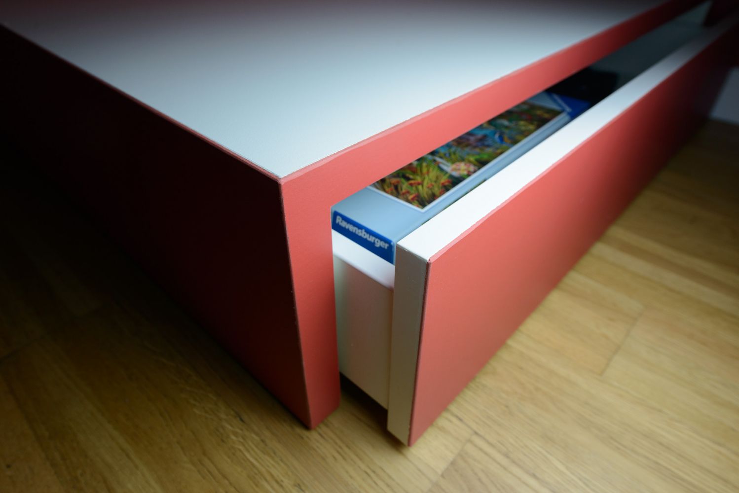 Die gartenseitige Giebelwand ist mit einem Sideboard ausgestattet, das mit einem DIN A0 Planschrank sowie 4 zusätzlichen Auszügen viel Raum für Archivierung und Sichtung bietet.