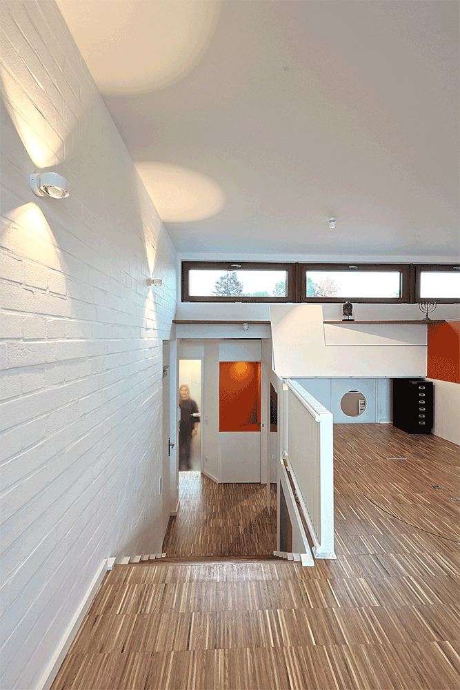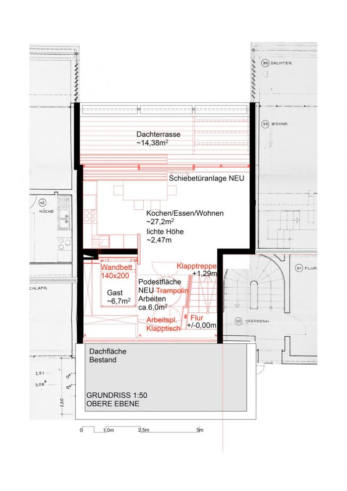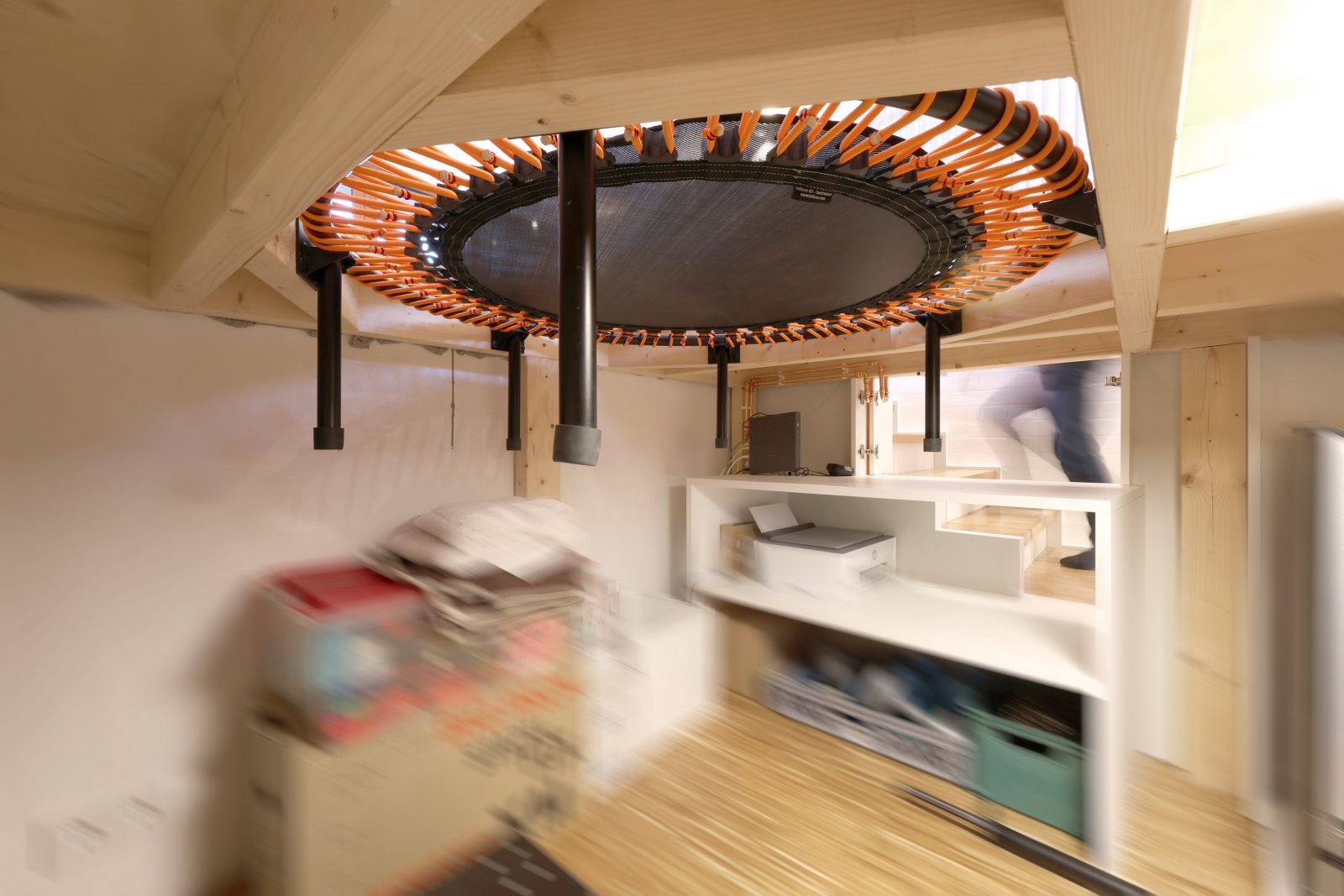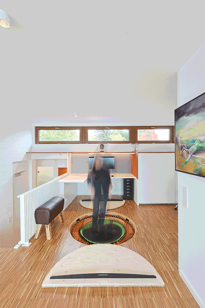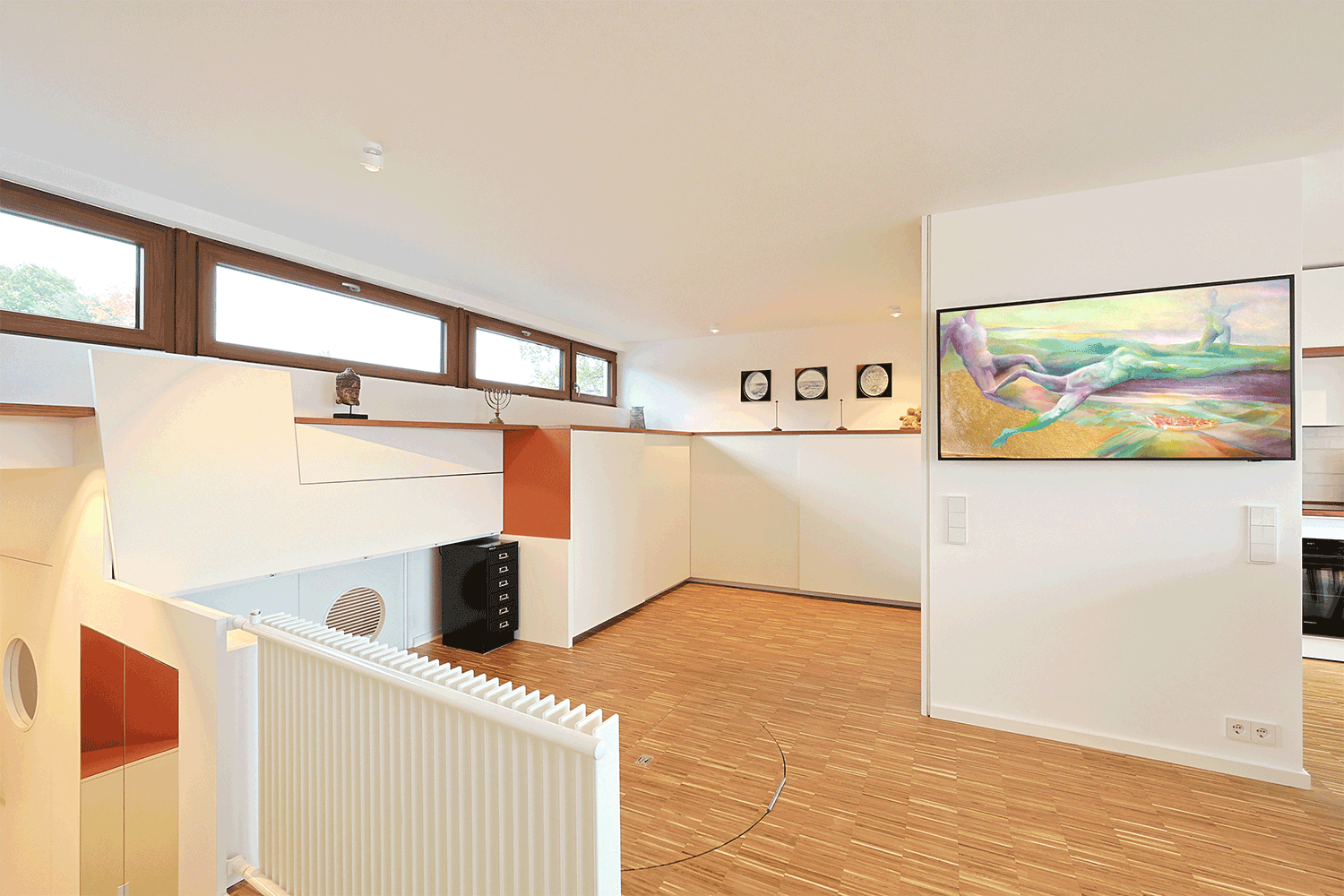Im Zentrum des Entwurfes steht die obere Splitlevel-Ebene. Ein neu konstruiertes Podest erweitert die Wohnfläche um sieben Quadratmeter und ersetzt frühere Verkehrsflächen des Flures; darunter entstand ein unauffällig eingebundener Kriechkeller. Die Bauherrin trainiert regelmäßig auf einem Trampolin und wünschte sich einen Ort der Aufbewahrung für das Sportgerät mit 1,25m Durchmesser. Dieser war mit Schaffung des Podestes schnell gefunden: bündig in den Boden eingelassene, halbkreisförmige Klappen erlauben schnellen Zugang, ohne das Tampolin bewegen zu müssen. Griffmulden aus dem Yachtbau im Parkett helfen beim Öffnen und unterseitig an den Klappen angebrachte T-Profile mit Griffaussparung verhindern ein Durchbiegen in geschlossenem Zustand.