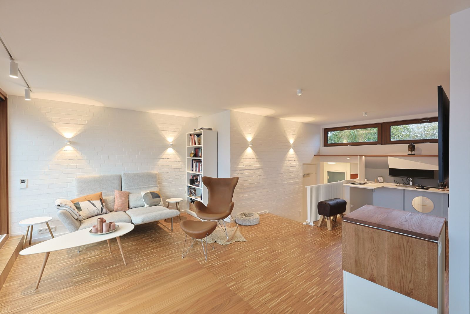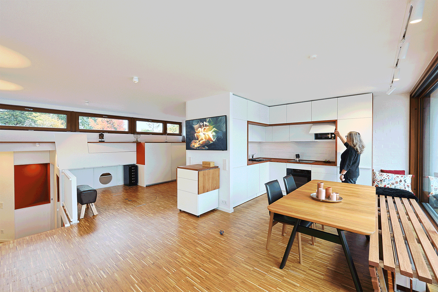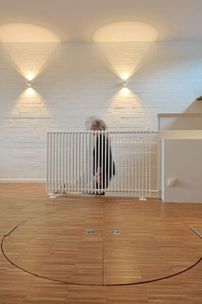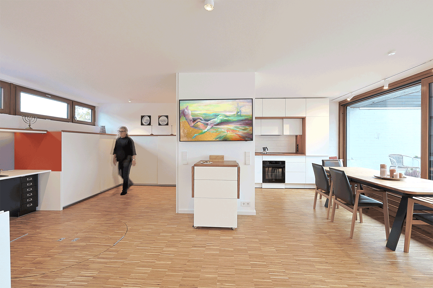 Im Zentrum des Entwurfes steht die obere Splitlevel-Ebene. Ein neu konstruiertes Podest erweitert die Wohnfläche um sieben Quadratmeter und ersetzt frühere Verkehrsflächen des Flures; darunter entstand ein unauffällig eingebundener Kriechkeller. Die Bauherrin trainiert regelmäßig auf einem Trampolin und wünschte sich einen Ort der Aufbewahrung für das Sportgerät mit 1,25m Durchmesser. Dieser war mit Schaffung des Podestes schnell gefunden: bündig in den Boden eingelassene, halbkreisförmige Klappen erlauben schnellen Zugang, ohne das Tampolin bewegen zu müssen. Griffmulden aus dem Yachtbau im Parkett helfen beim Öffnen und unterseitig an den Klappen angebrachte T-Profile mit Griffaussparung verhindern ein Durchbiegen in geschlossenem Zustand.