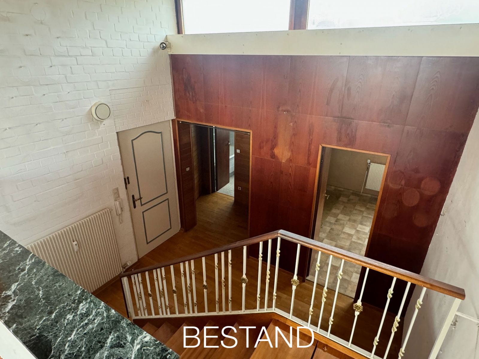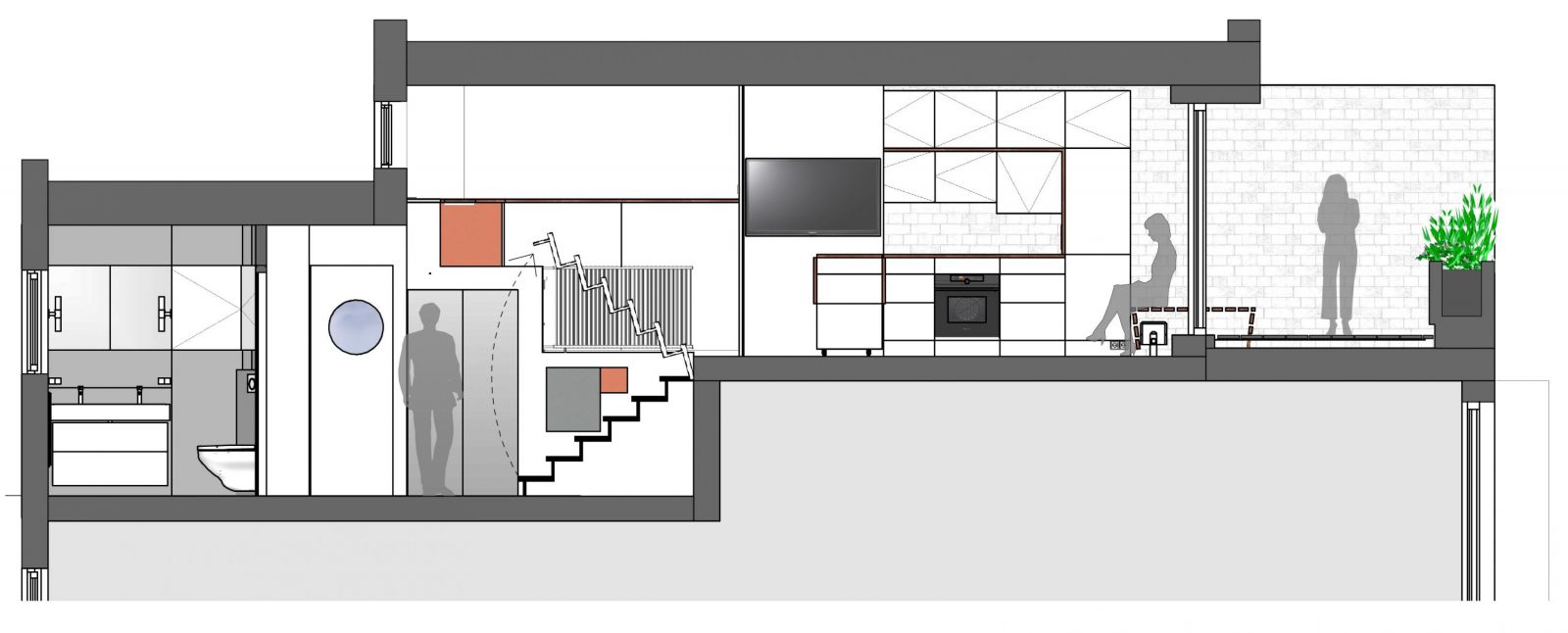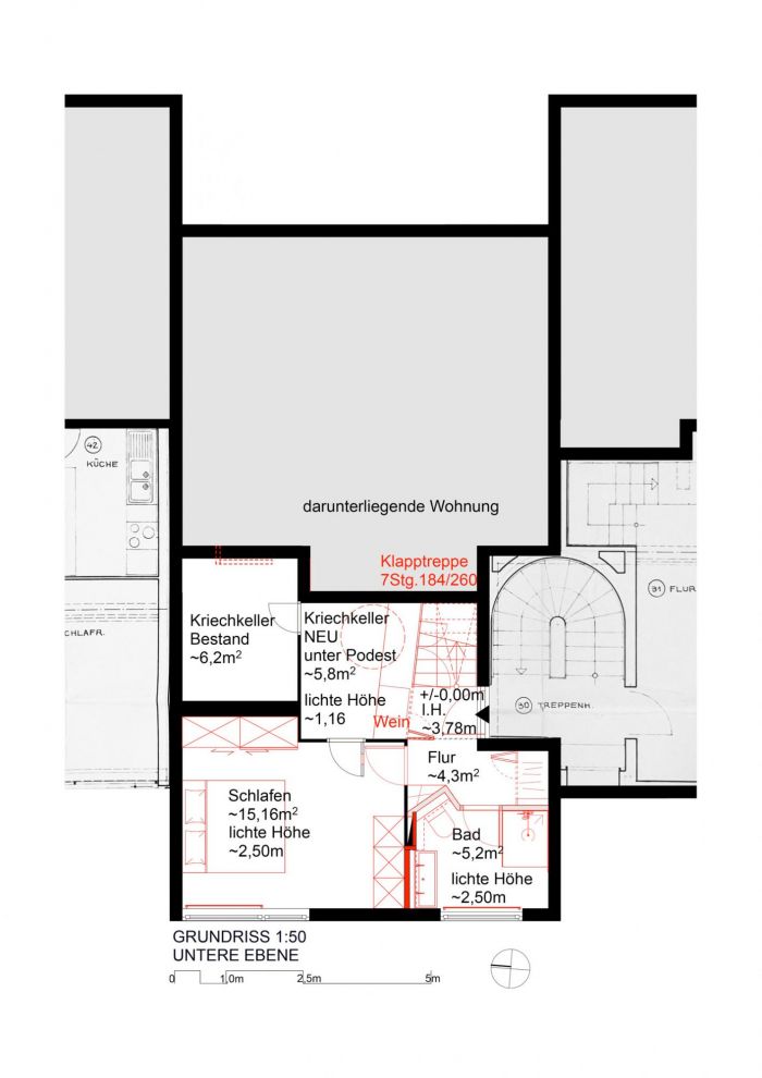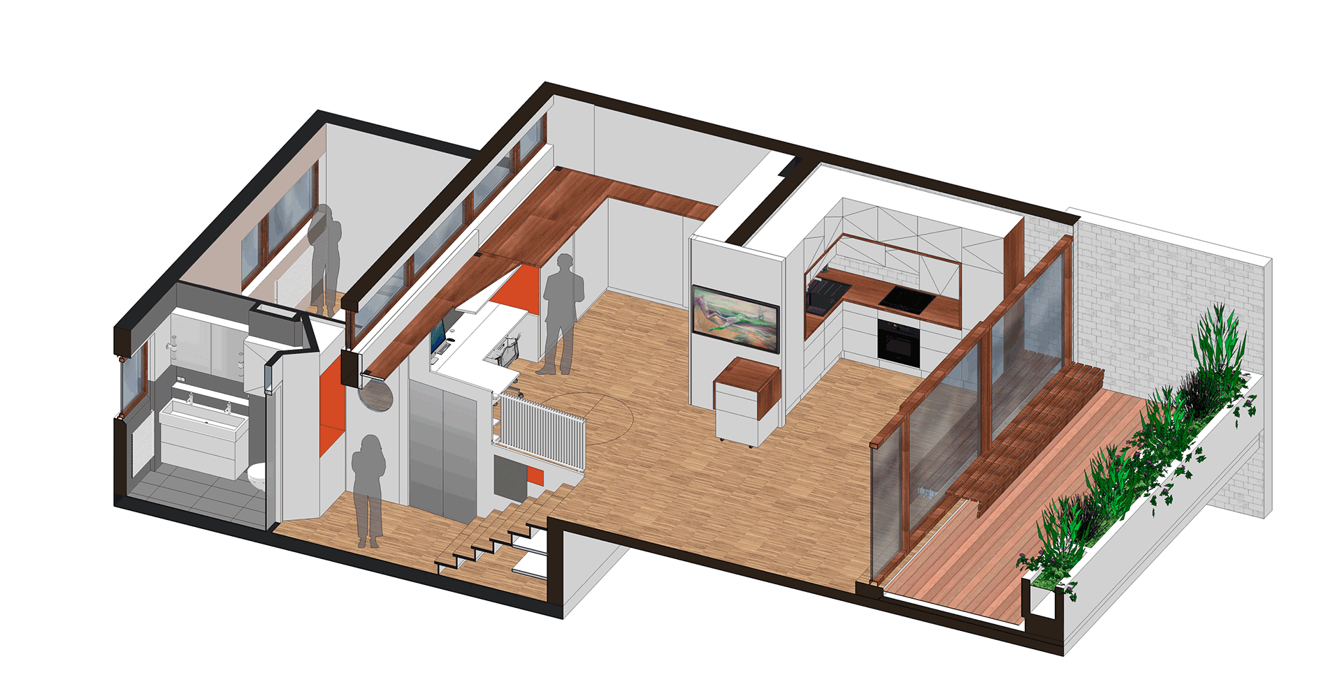 Im Zentrum des Entwurfes steht die obere Splitlevel-Ebene. Ein neu konstruiertes Podest erweitert die Wohnfläche um sieben Quadratmeter und ersetzt frühere Verkehrsflächen des Flures; darunter entstand ein unauffällig eingebundener Kriechkeller. Die Bauherrin trainiert regelmäßig auf einem Trampolin und wünschte sich einen Ort der Aufbewahrung für das Sportgerät mit 1,25m Durchmesser. Dieser war mit Schaffung des Podestes schnell gefunden: bündig in den Boden eingelassene, halbkreisförmige Klappen erlauben schnellen Zugang, ohne das Tampolin bewegen zu müssen. Griffmulden aus dem Yachtbau im Parkett helfen beim Öffnen und unterseitig an den Klappen angebrachte T-Profile mit Griffaussparung verhindern ein Durchbiegen in geschlossenem Zustand.