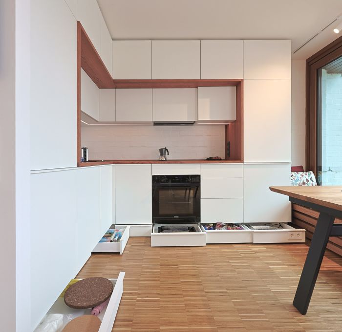 Die neue raumhohe Einbauküche befindet sich nun im Hauptwohnraum neben der Terrasse und nutzt mit Sockelschubladen jegliches Aufbewahrungspotenzial. Als Ergänzung steht ein mobiles Anrichtenelement mit drei Auszügen zur Verfügung, das dank zweier ausklappbarer Ergänzungsplatten zusätzliche Arbeitsflächen von 60 bis 140cm Länge bietet. Eine integrierte Kabelaufwickelautomatik mit fünf Metern Kabellänge erlaubt flexible Positionierung über die gesamte obere Ebene hinweg.