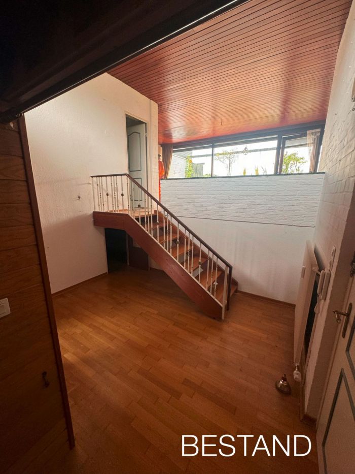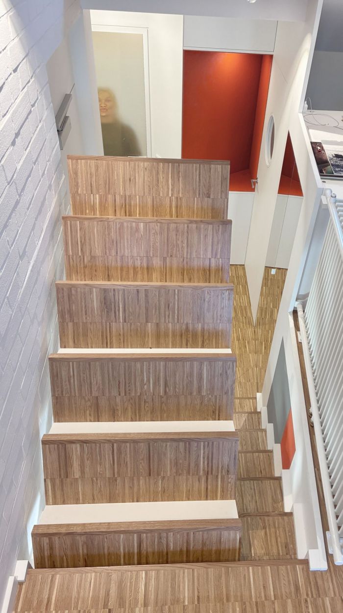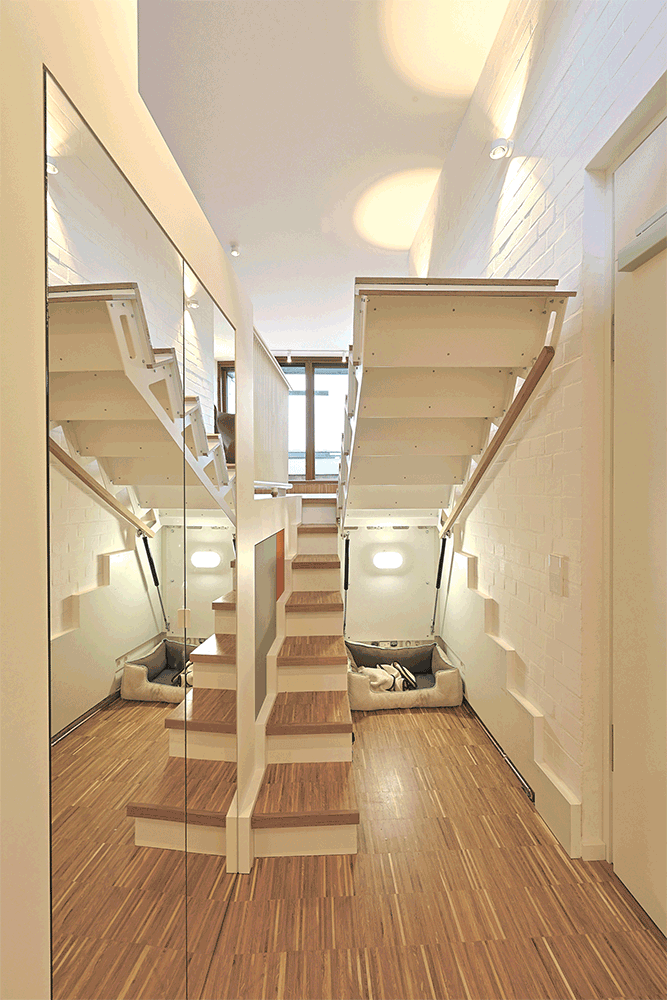 Die neue Splitlevel-Treppe aus (brandschutzkonformem) Stahl ist mit Stäbchenparkett belegt und lässt sich Dank zweier Gasdruckfedern butterweich vollständig nach oben klappen, um Stauraum freizugeben. Die Absturzsicherung übernimmt ein Designheizkörper mit transparenten Lamellen.