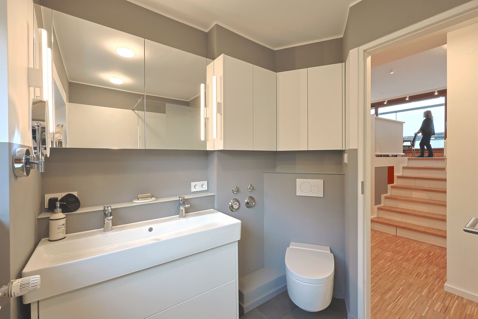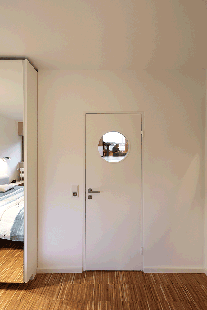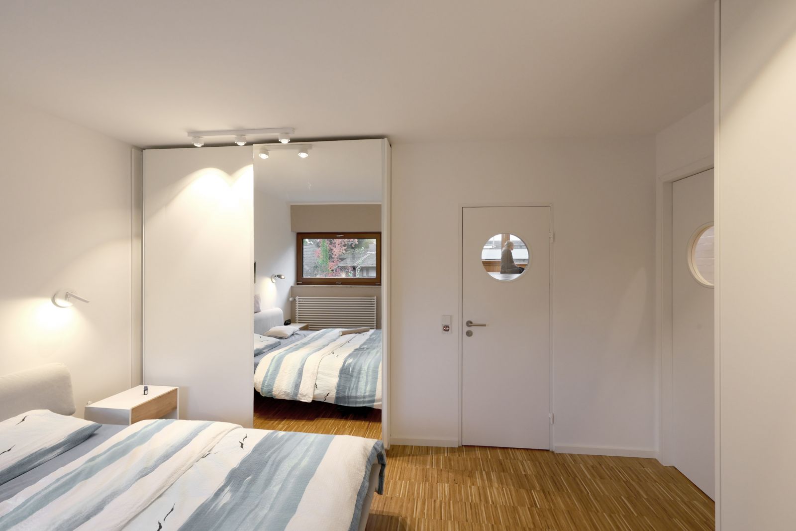 Im Schlafzimmer blieb die frühere Zugangstür erhalten und ermöglicht heute den Zugang zum Kriechkeller sowie dank neuem Bullauge eine Blickachse unter dem Arbeitsplatz hinweg zum Wohnraum. Das Bad erhielt einen vollständig neuen Grundriss mit warm-grey Wandflächen und einem umlaufenden weißen Band aus Wand- und Spiegelschränken - auf Fliesen wurde komplett verzichtet. Die großzügige Dusche ist fugenlos und pflegeleicht mit weißen PVC-Platten verkleidet.
