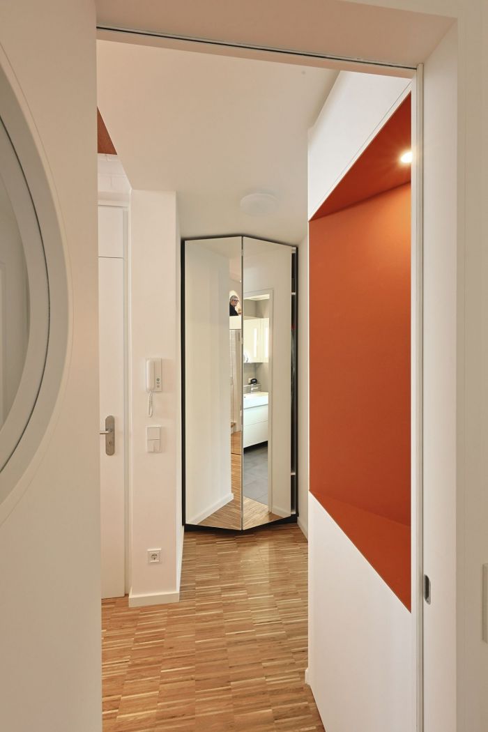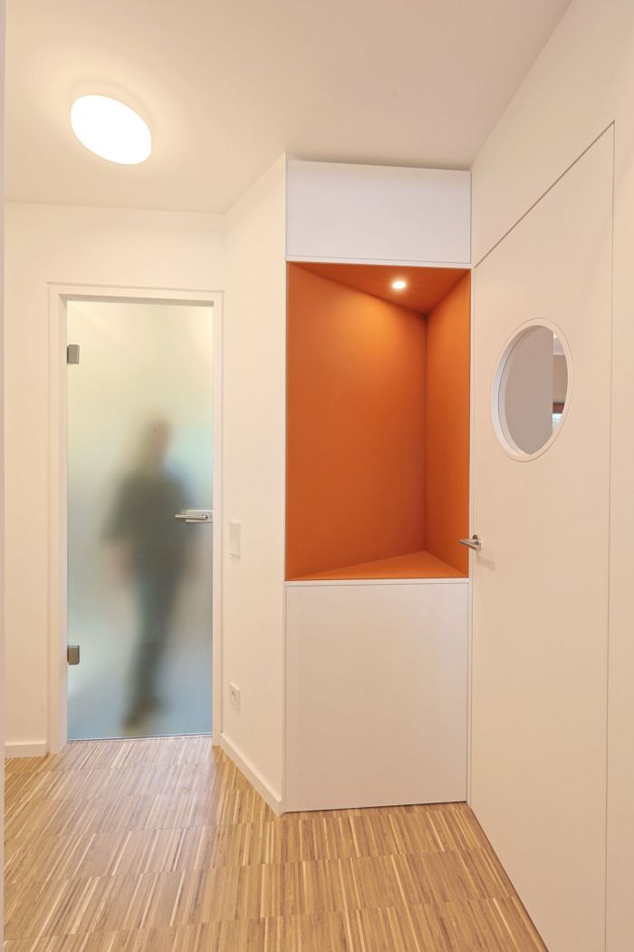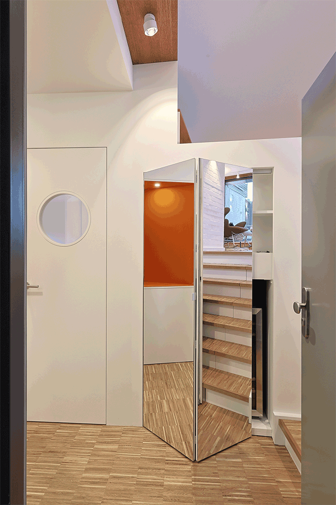 Auch die untere Eingangsebene erfuhr eine pragmatische Umstrukturierung. Der minimierte Flur erschließt einen Garderoben- und einen Regalschrank mit Weinkühlschrank. Die großen Spiegel-Faltschiebetüren erweitern den Raumeindruck und bieten unerwartete Blickachsen durch die gesamte Wohnung. Eine Durchreiche mit zwei farbigen Klappen erleichtert von der Treppe aus die Beschickung des Kriechkellers. Ein beleuchteter Nischenschrank mit orangefarbenem Bulletinboard begradigt die geneigte Wand zum Bad und setzt einen warmen Akzent. Bad und Schlafzimmer erhielten eine neue Erschließung vom niedrigeren Flurbereich aus.