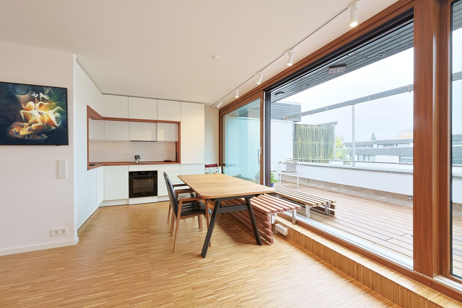 Der Rückbau der ehemals abgetrennten Landhausküche und das Entfernen der Trennwand ließen ein durchgehendes Raumkontinuum entstehen, das Küche, Essen, Wohnen, Arbeiten und Gastbereich erstmals selbstverständlich miteinander verbindet. Besonders prägend ist die neue Terrassenverglasung: Wo früher eine kleine Glastür saß, öffnet heute eine großflächige Schiebetür den Essbereich weit nach außen und lässt den Raum deutlich größer wirken.