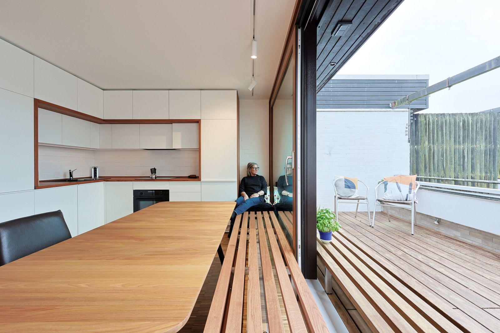Entlang der Terrassenverglasung begleiten Sitzbänke sowohl den Ess- als auch den Terrassenbereich. Zur Küche hin bildet die Bank eine geschützte Sitznische als Ort zum Lesen und Entspannen. Die Terrasse selbst erhielt einen Belag aus dauerhaften Kebony-Holz und eine neue Bepflanzung der bauzeitlichen Pflanztröge.