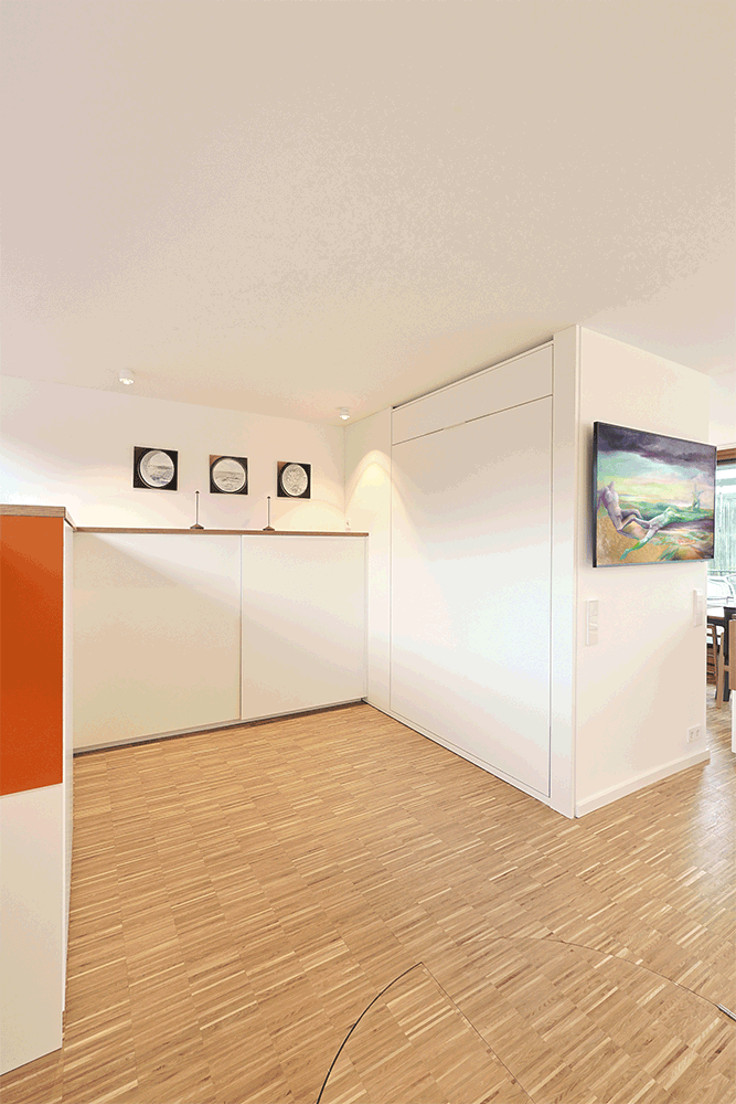 Der Arbeits- und Gästebereich bleibt trotz der Offenheit klar definiert. Ein zweiteilig klappbarer Sekretär macht den beleuchteten Homeoffice-Arbeitsplatz unsichtbar, sobald er nicht benötigt wird. Ein im Wandschrank integriertes 1,40m breites Klappbett mit Beleuchtung und Regalfächern verwandelt den Raum bei Bedarf in ein vollwertiges Gästezimmer.