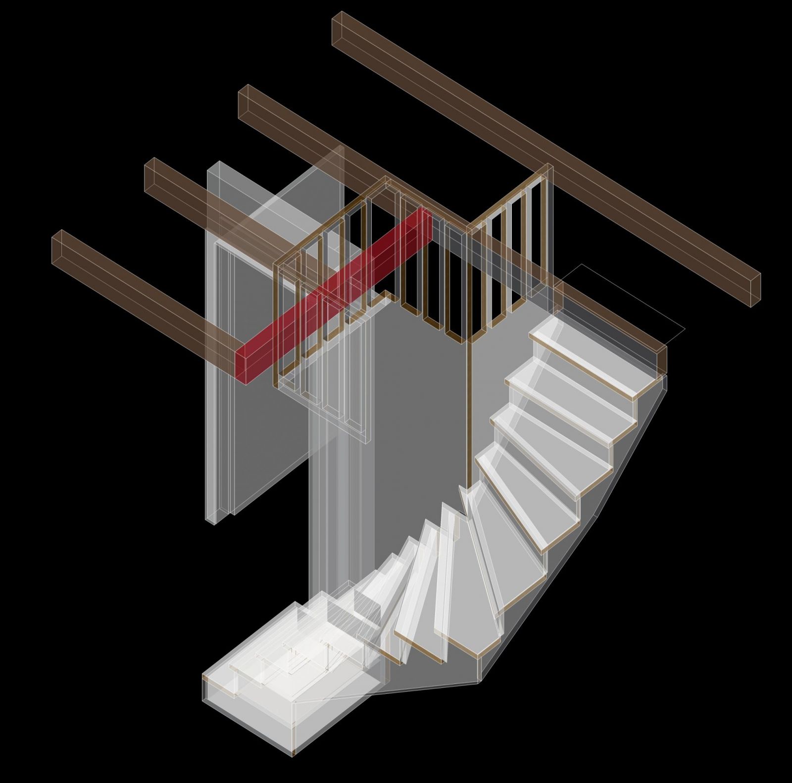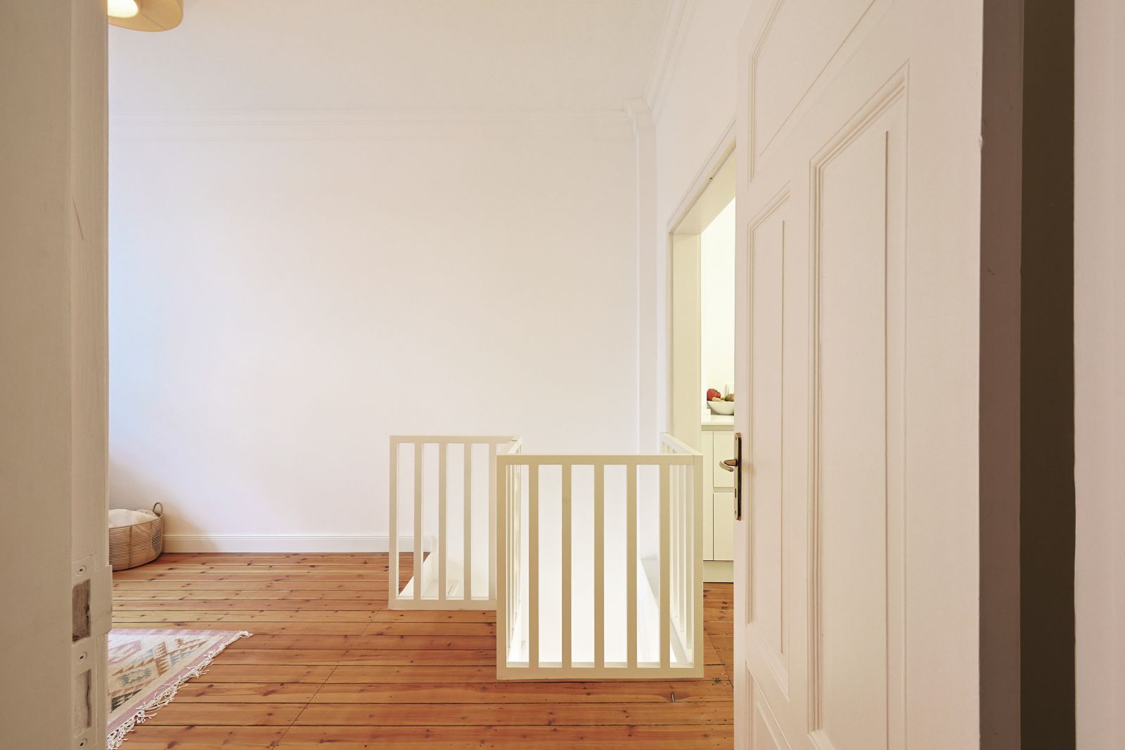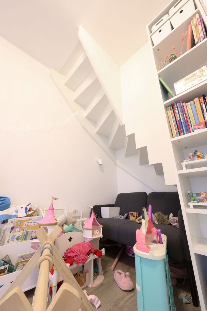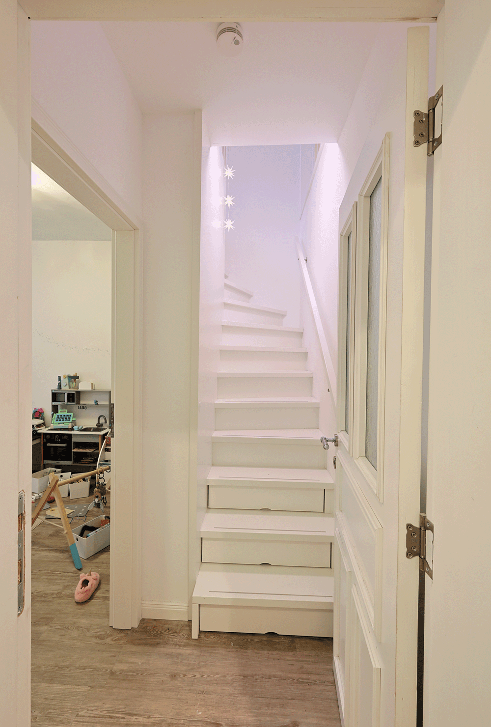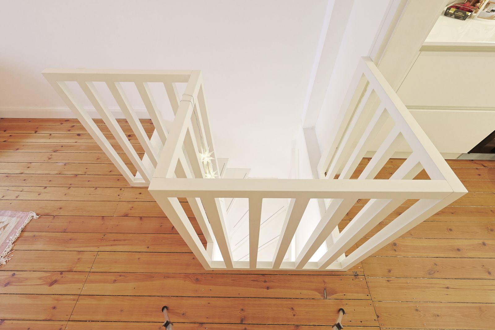 Die L-förmige, viertelgewendelte Treppe ist funktional wie konstruktiv die effizienteste Lösung zur Verbindung des unteren Flures mit dem Koch-, Ess- und Wohnbereich im Obergeschoss. Der statische Eingriff beschränkt sich auf das Einbringen eines einzelnen Wechselbalkens in die vorhandene Holzdeckenkonstruktion. Die Multiplexwangen übernehmen neben der Führung der Stufen auch tragende Funktionen für Teile des angrenzenden Pitchpine-Bodens. Konstruktion und Ausbau sind somit nicht getrennt, sondern ergänzen sich. Die Geländer sind als gefräste Stabgeländer direkt aus den Wangen entwickelt und fortgeführt. Zusätzliche Bauteile, Hervorhebungen oder formale Akzente wurden vermieden was z.B. auch durch die weiß lackierten Fräskanten des Multiplex’ verdeutlicht wird. Die Untersicht des Treppenlaufs bildet beiläufig eine skulpturale Spiel- und Sitznische im Kinderzimmer aus.