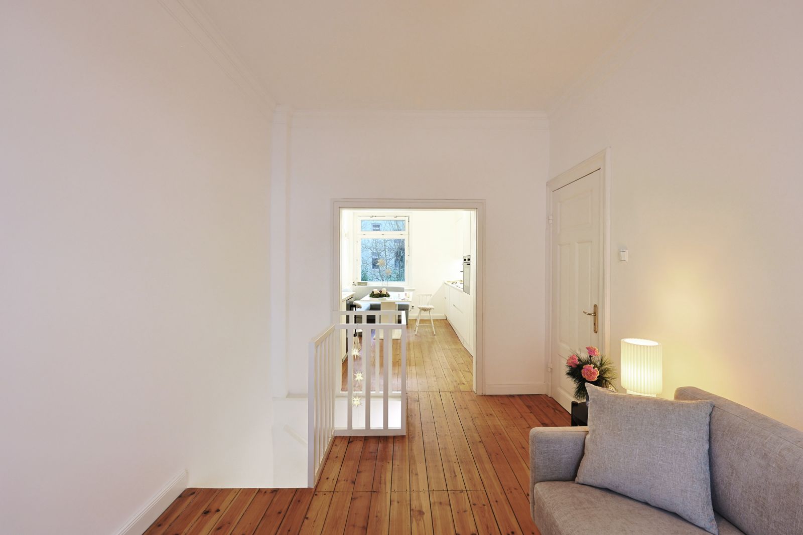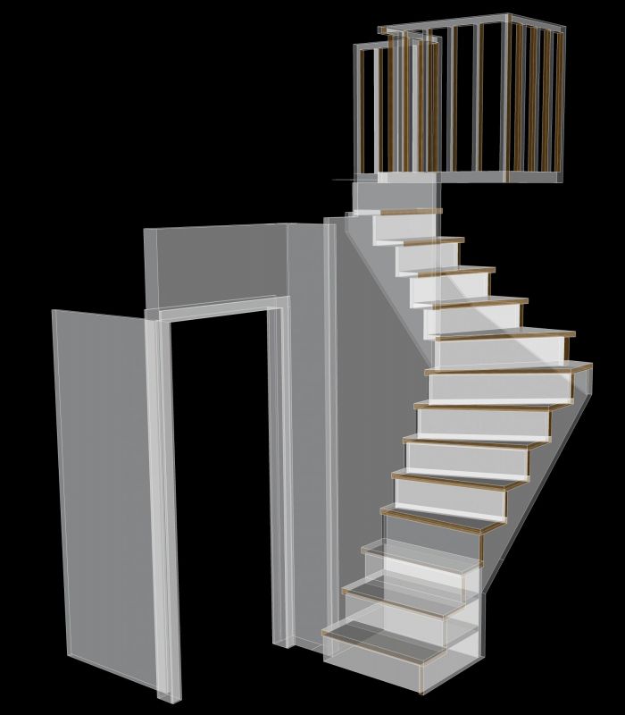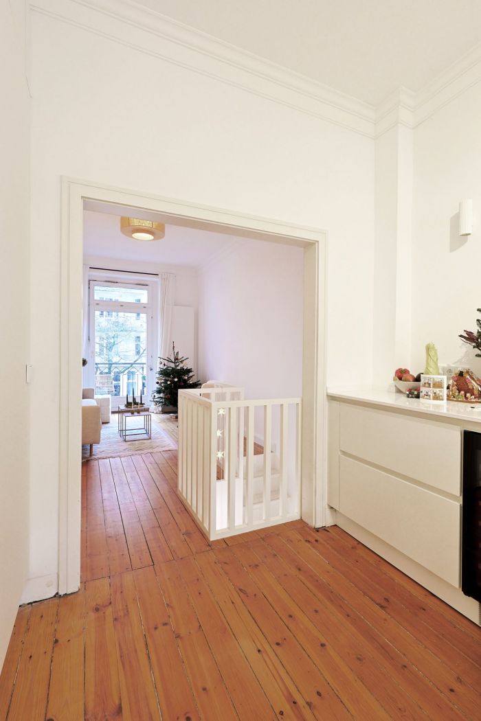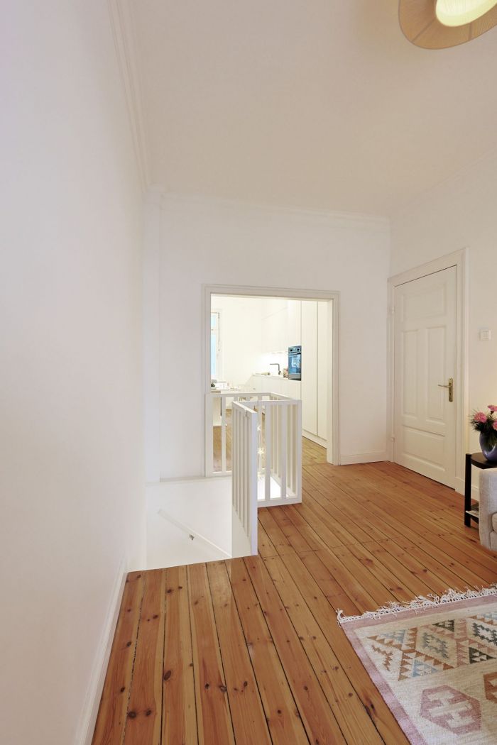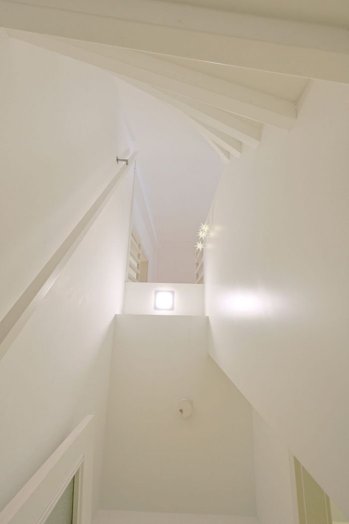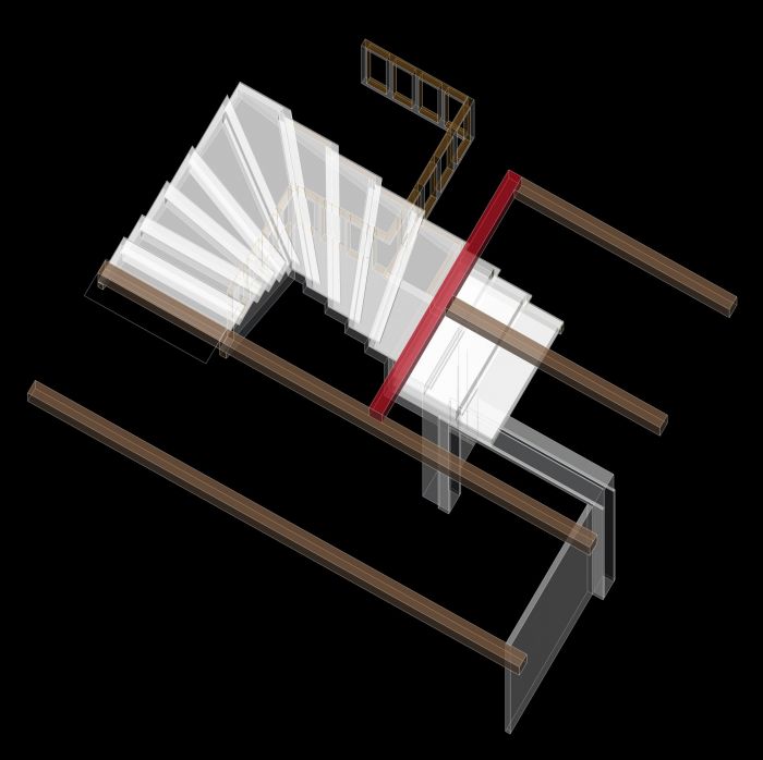 Die L-förmige, viertelgewendelte Treppe ist funktional wie konstruktiv die effizienteste Lösung zur Verbindung des unteren Flures mit dem Koch-, Ess- und Wohnbereich im Obergeschoss. Der statische Eingriff beschränkt sich auf das Einbringen eines einzelnen Wechselbalkens in die vorhandene Holzdeckenkonstruktion. Die Multiplexwangen übernehmen neben der Führung der Stufen auch tragende Funktionen für Teile des angrenzenden Pitchpine-Bodens. Konstruktion und Ausbau sind somit nicht getrennt, sondern ergänzen sich. Die Geländer sind als gefräste Stabgeländer direkt aus den Wangen entwickelt und fortgeführt. Zusätzliche Bauteile, Hervorhebungen oder formale Akzente wurden vermieden was z.B. auch durch die weiß lackierten Fräskanten des Multiplex’ verdeutlicht wird. Die Untersicht des Treppenlaufs bildet beiläufig eine skulpturale Spiel- und Sitznische im Kinderzimmer aus.