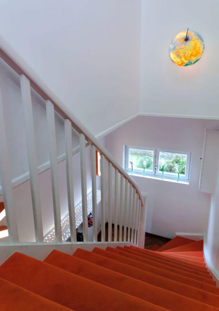 Die neue Treppe ist die extreme Weiterentwicklung einer herkömmlichen Spindeltreppe zur Nutzung deren kompletten Luftraumes. Platzmangel sowie die bestehenden Zugbalken der Dach- und Deckenkonstruktion erforderten eine Neuinterpretation der klassischen Wendeltreppe. Die neue imaginäre Spindel verläuft diagonal durch den Raum und man bewegt sich in einem Korridor um sie herum. Es entsteht eine Treppenskulptur, die sich bei gleicher Ein- und Austrittsbreite lediglich mit einem Viertel der Grundfläche einer vergleichbaren traditionellen Spindeltreppe begnügt. Die orange lackierte Holztreppe verbindet sich mit dem ebenfalls orangefarbenen Kautschukbelag des Spitzbodens.