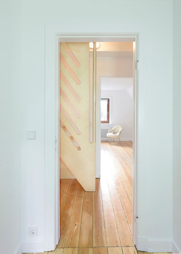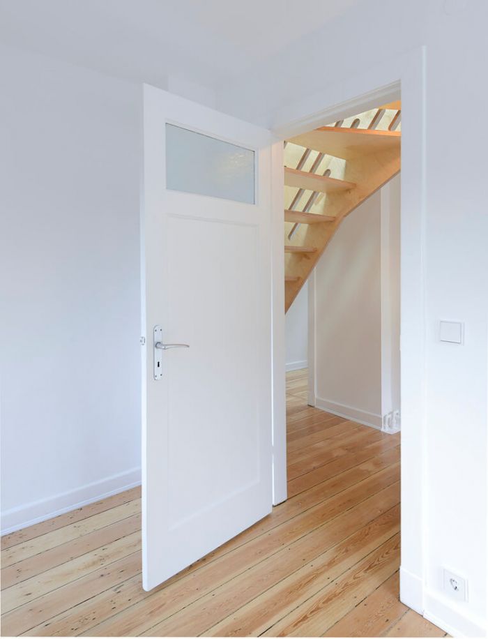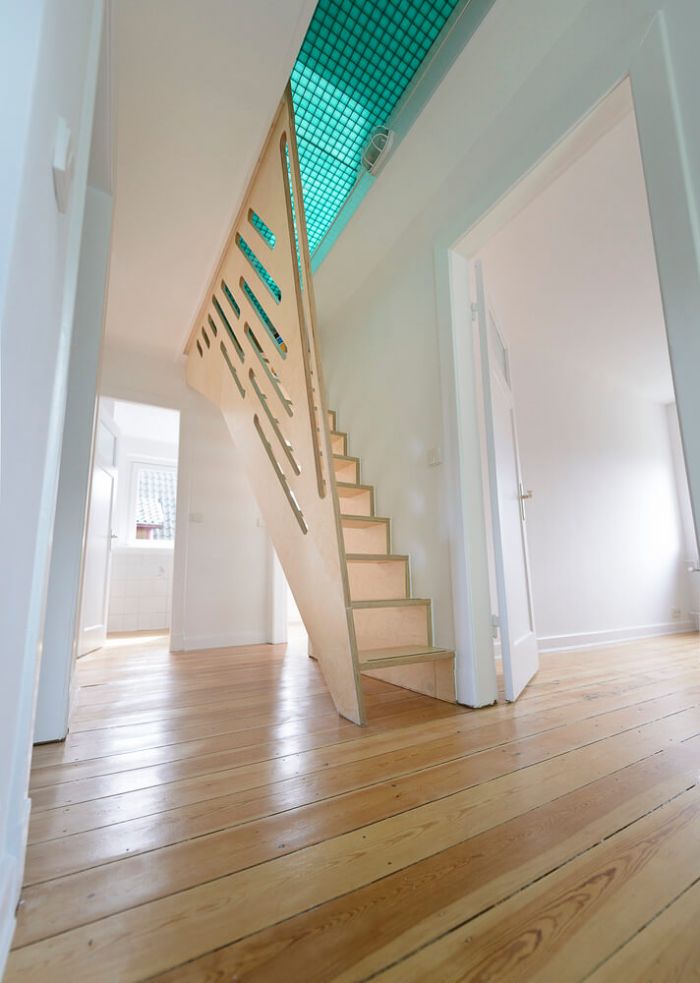 Die räumlichen Veränderungen beschränken sich auf wenige gezielte Eingriffe. Der bisher ungenutzte Spitzboden ist durch eine neue Treppe zugänglich gemacht, die in den Flur des Obergeschosses integriert werden konnte. Ursprünglich lediglich über eine Leiter erschlossen, beherbergt der Speicher nun ein vollwertiges und lichtdurchflutetes Zimmer. Die Wohnfläche konnte so von ca. 100 m2 auf ca. 120 m2 erhöht werden.