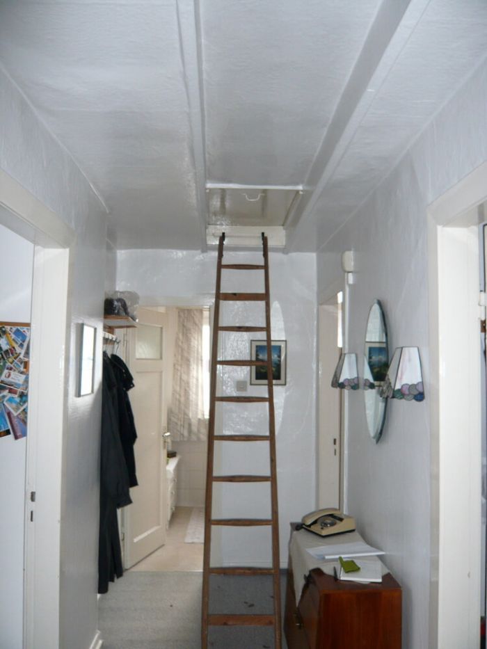 Die neue, einläufige Spitzbodentreppe ist passgenau in die vorhandene Deckenaussparung für die ehemalige Dachbodenleiter eingearbeitet. Die Zugsparren der Dachkonstruktion verhindern dabei eine Verbreiterung der Öffnung. Da der Durchgang im 1,30m breiten Flur zu Bad und Schlafzimmern gewährleistet bleiben muss, sind die Grenzen der räumlichen Ausdehnung der neuen Treppe klar definiert.