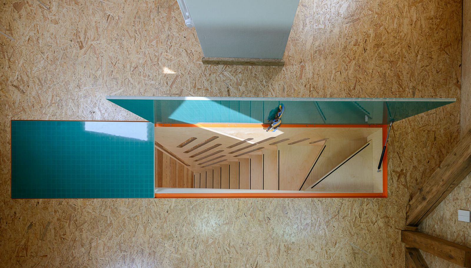 Ein Knick in Höhe der neunten Stufe markiert den Übergang zur Wendelung des Austrittes im Spitzboden. Als Handlauf dienen sechs übereinander angeordnete Aussparungen, die vom Kleinkind bis zum Erwachsenen stets die optimale Höhe bereithalten.