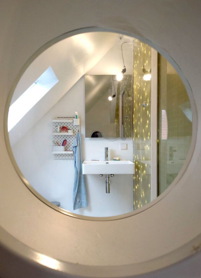 Der große und offene Dachboden eines Wohnhauses sollte zur multifunktionalen Fläche mit Tischfußballspiel, Gästezimmer, Musik- und Leseraum sowie einem zusätzlichen Bad umfunktioniert werden. Das Badezimmer konnte stimmig in die Dachschräge integriert werden und die Trockenbauwand zum Hauptraum ist beidseitig mit glasfaserverstärkten Polyesterplatten verkleidet (anstatt mit Gipskarton...). LEDs im Zwischenraum beleuchten sowohl Hauptraum als auch Bad.